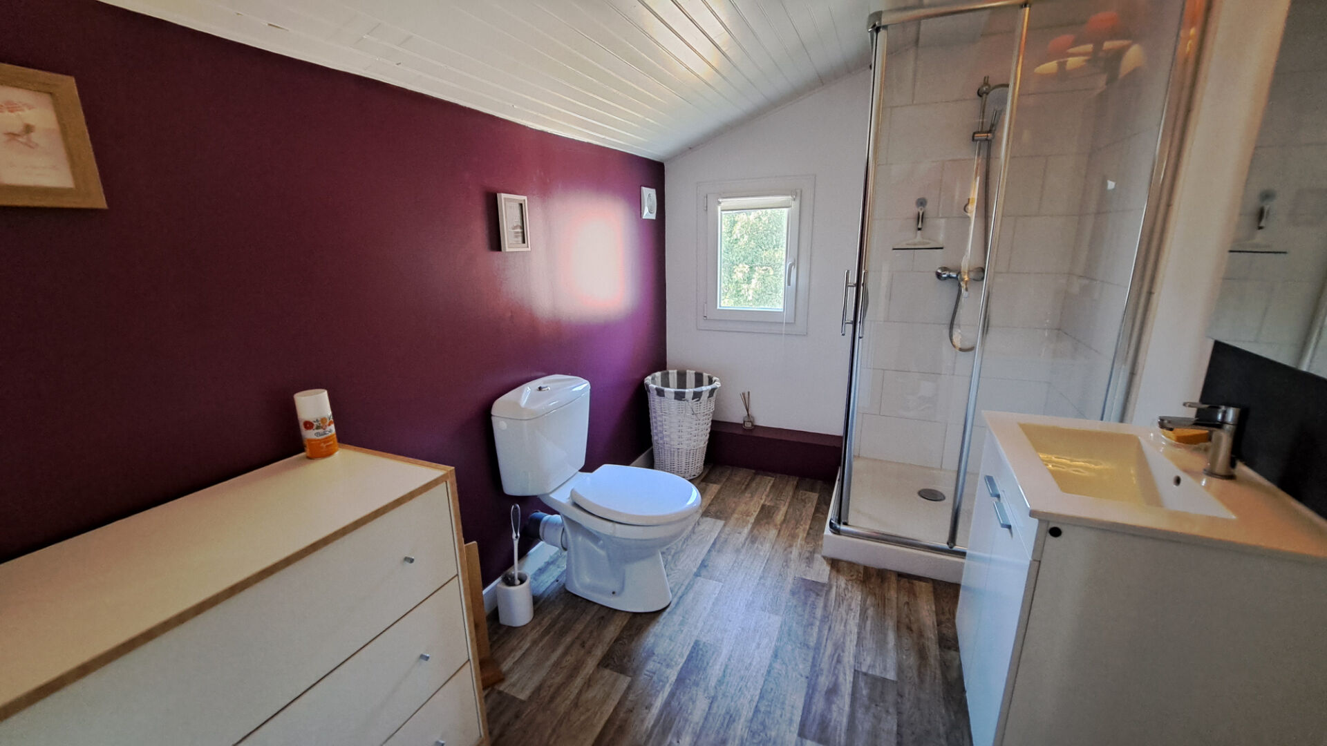 A l'étage, le palier dessert 2 grandes chambres avec de nombreux rangements, et une salle d'eau avec wc