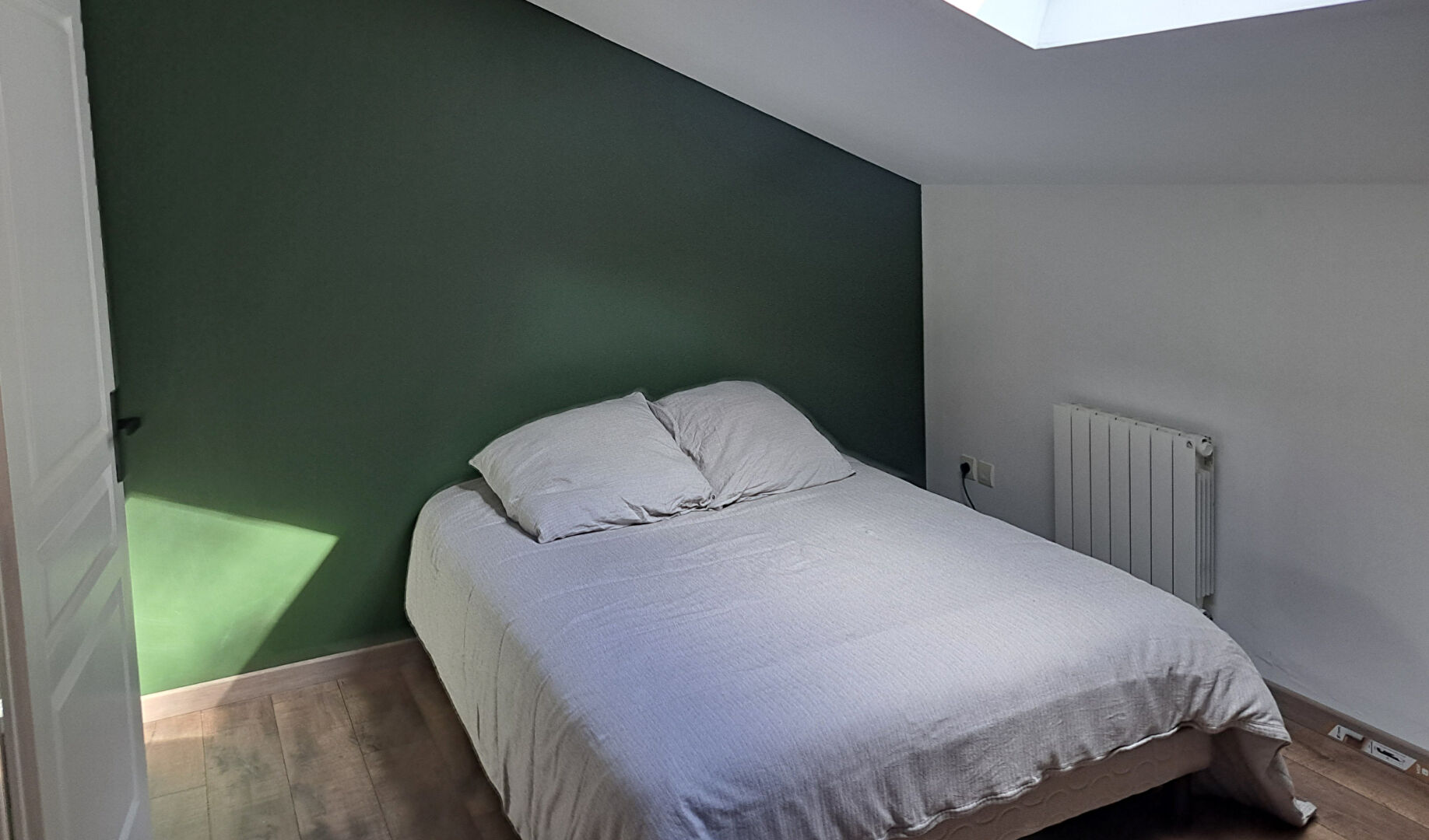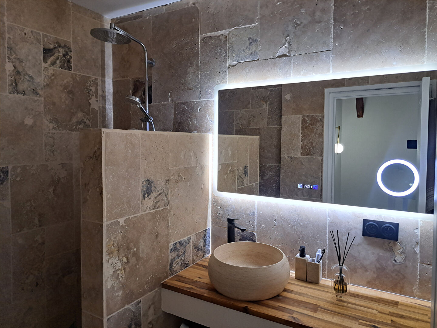 A l'étage, deux grandes chambres mansardées avec placard, une salle d'eau neuve en travertin, douche à l'italienne.