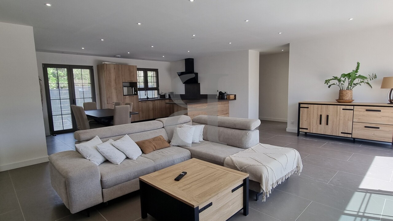 Cette maison moderne se compose d'une pièce à vivre très lumineuse de plus de 50 m², de 4 chambres, dont une suite parentale avec dressing et salle d'eau privative de 25 m², d'une salle de bain avec douche italienne et baignoire, et d'un garage.