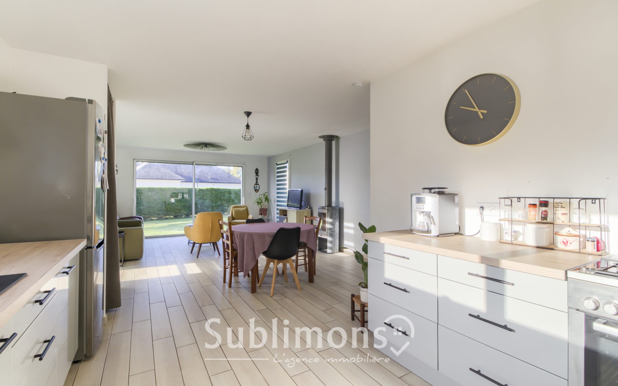 Dès l'entrée, un salon-séjour chaleureux avec poêle à bois s'ouvre sur une cuisine américaine aménagée et équipée. Deux chambres, dont une suite parentale avec salle d'eau privative, offrent des espaces nuit distincts et pratiques. L'ensemble est complété par une seconde salle d'eau, un cellier, un WC et un grand garage de 30 m².