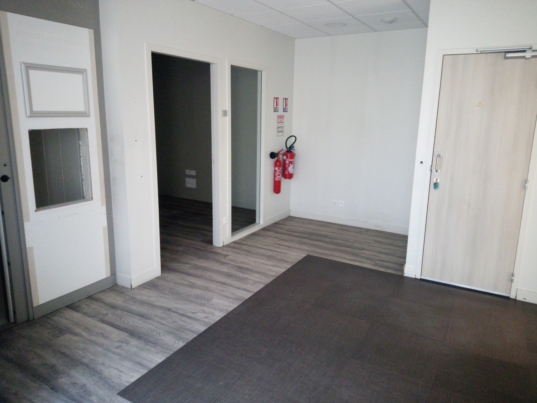 Hall d'entrée, espace accueil, 2 bureaux, une pièce à sécurité renforcée disposant d'un accès sur