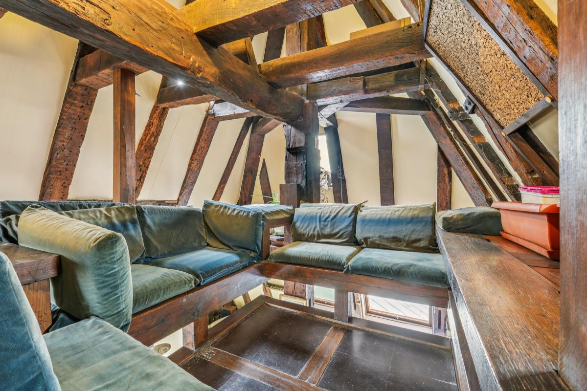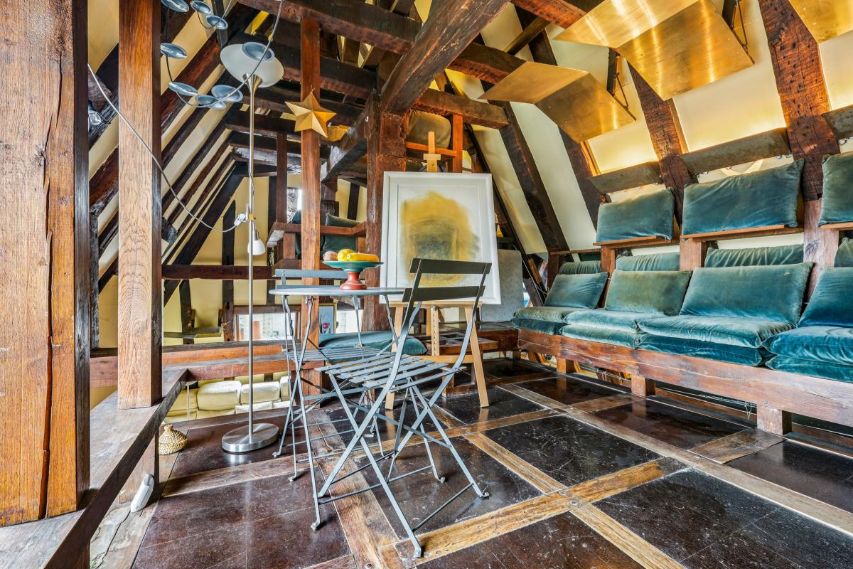 A la fois loft et appartement de réception, il se compose ainsi : chambre, cuisine ouverte, salle de bains, toilettes séparées, bureau et enfin un salon 'suspendu' idéal pour admirer la vue plongeante exceptionnelle sur la place des Vosges.