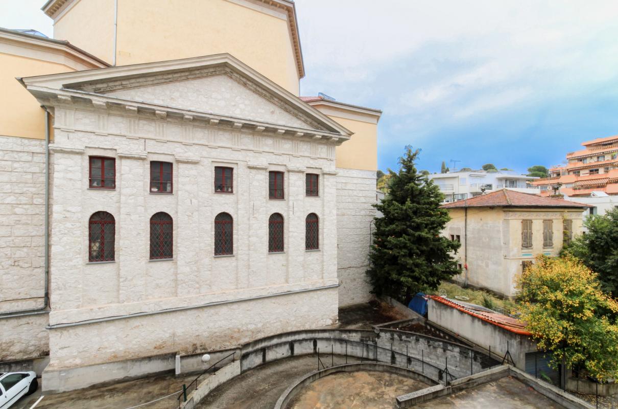 L'appartement donne sur une cour extérieure calme, avec une vue sur l'église voisine, apportant une touche de caractère et d'authenticité au cadre.