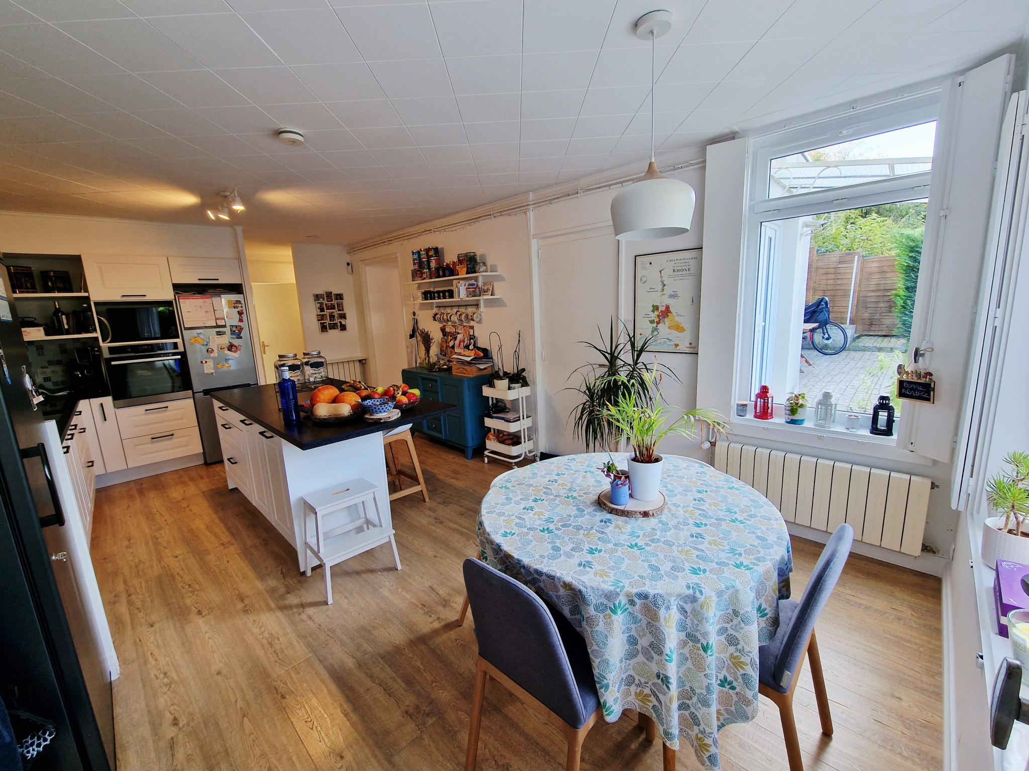 - d'une entrée, d'un double salon (env 27m2) et d'une cuisine équipée ouverte sur un espace salle à manger (env 24m2) donnant sur la terrasse et le jardin,