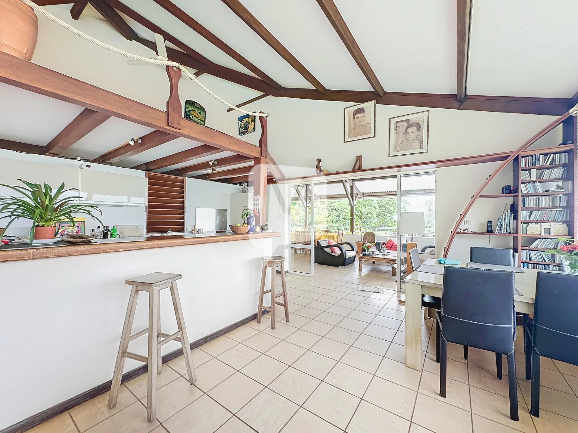 Au 1er étage, cette maison vous offre une cuisine aménagée et équipée ouverte sur un séjour lumineux de 46 m², avec une belle hauteur sous plafond permettant de dégager une mezzanine de 13 m².