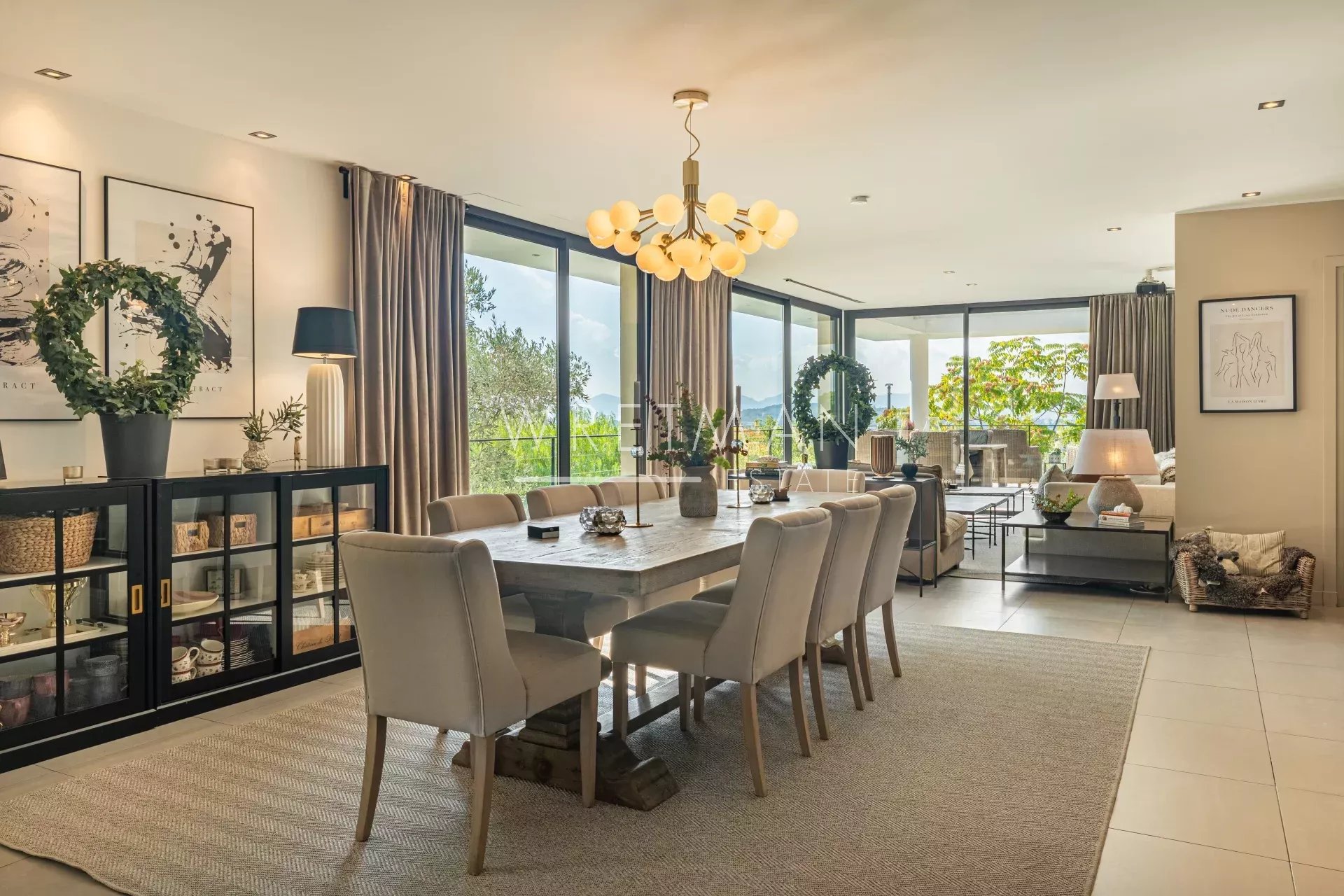 Le niveau principal accueille un vaste séjour avec salle à manger et cuisine américaine entièrement équipée, ouvrant sur une superbe terrasse offrant une vue panoramique sur la mer, les montagnes et la verdure.