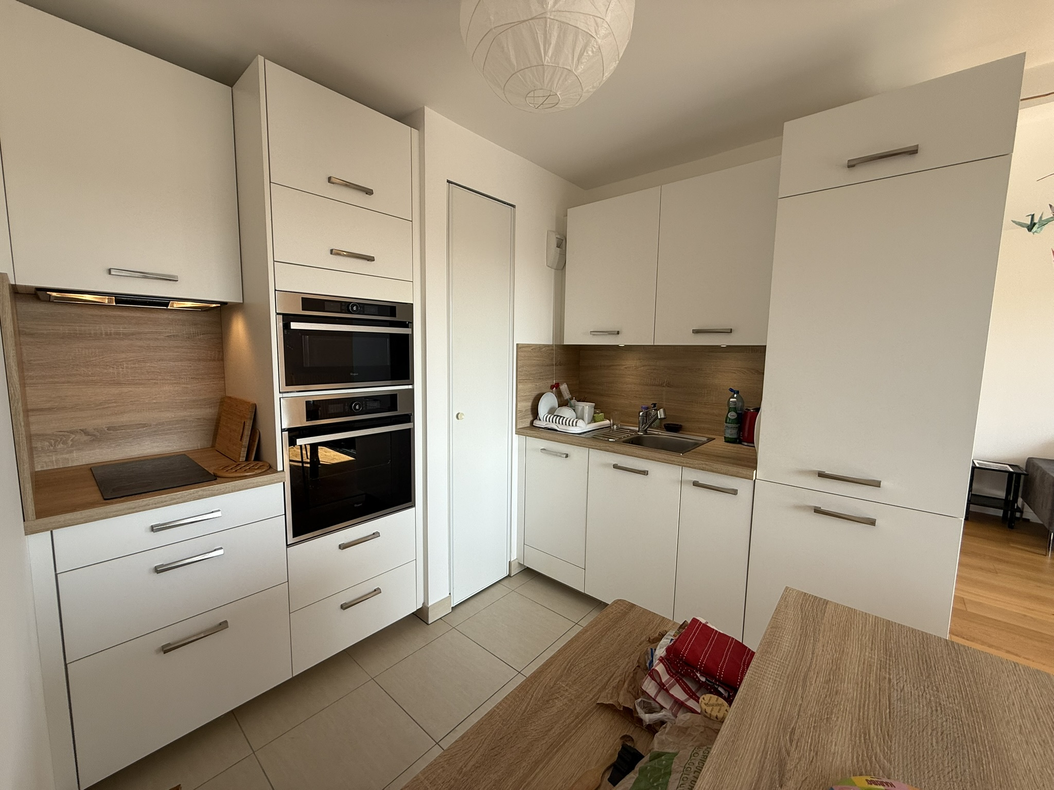 - une entrée avec placards (8,45m2) desservant une pièce de vie (25m2) avec une cuisine ouverte de qualité (marque Mobalpa) aménagée-équipée (plaque de cuisson, hotte, four, four à micro-ondes encastré, lave-vaisselle, réfrigérateur encastré, congélateur encastré), le tout donnant accès à la terrasse (7,54m2) exposition Sud ;