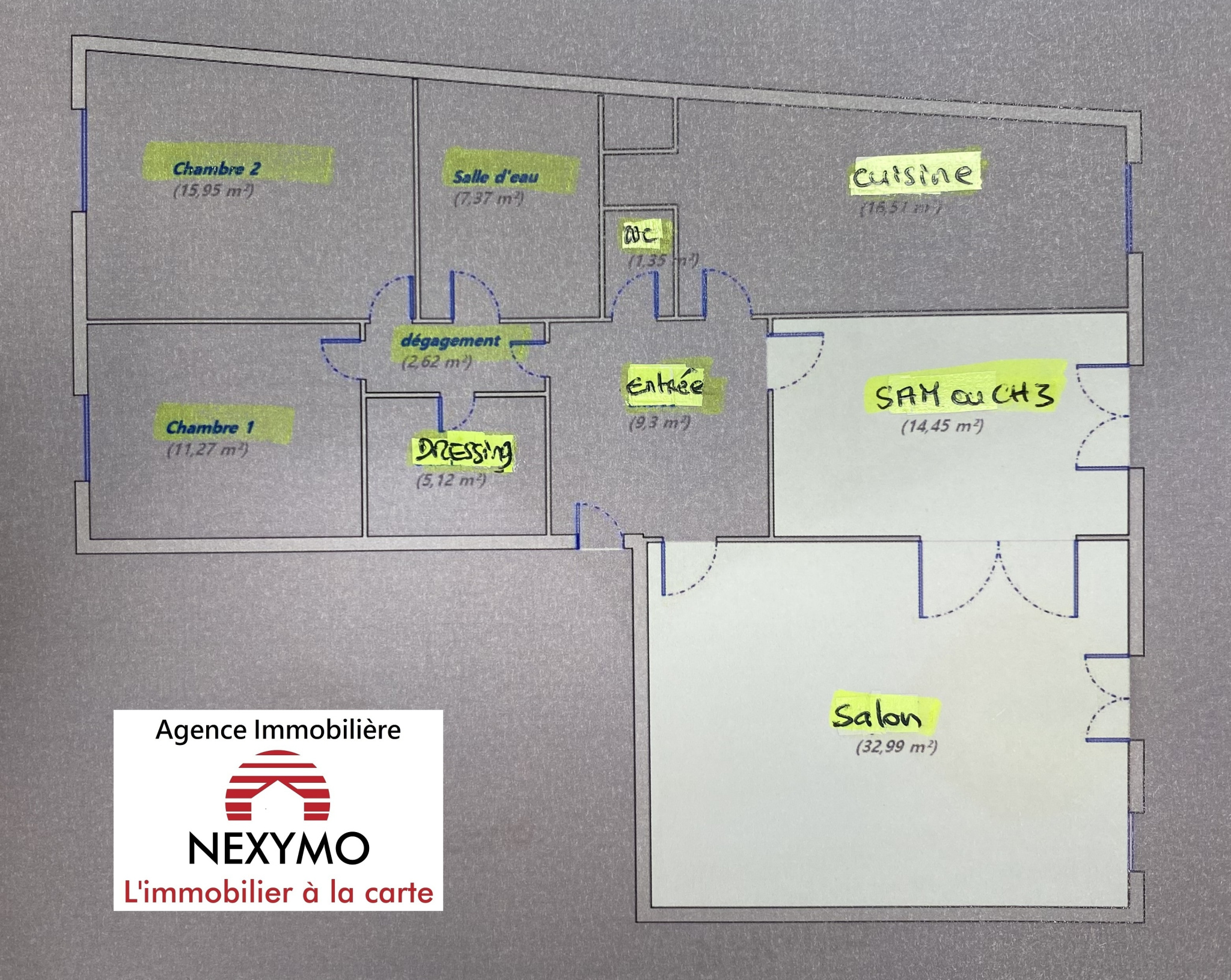 NEXYMO vous propose, quartier CROIX DE PIERRE, ce bel appartement de 116.93 m2 qui vous séduira par ses volumes confortables (séjour de 47 m2), sa luminosité et sa vue dégagée sur Le Mans. Une belle entrée distribue, d'un côté deux grandes chambres, un dressing, une salle de douche et un wc et de l'autre une cuisine de 16m2 et un séjour double de 47 m2. Une troisième chambre pourrait être envisageable facilement, à la place de la salle à manger (voir plan joint). Côté annexes, le bien dispose d'une cave et d'un garage fermé privatif au sein de la copropriété. La résidence, sécurisée et bien entretenue, est située au coeur d'un quartier dynamique avec le tramway, les commerces et les écoles à proximité. La place des Jacobins et l'hypercentre du Mans ne sont qu'à 5 minutes à pied de ce lieu. Pour information, les charges de copropriété, chauffage inclus, s'élevaient, en 2024, à environ 272 EUR par mois (soit 3269 EUR sur l'année). Vous recherchez un appartement avec deux ou trois chambres, une grande pièce de vie avec vue imprenable sur le Mans, un garage, le tout à proximité des commerces, du tramway et de la gare SNCF, ne cherchez plus, c'est ici !!! Pour visiter, contactez-moi : Anthony PETIT - Agence NEXYMO, RCS 829618156.- ref AP1381- (Honoraires charge vendeur). Les informations sur les risques auxquels ce bien est exposé sont disponibles sur le site Géorisques : www.géorisques.gouv.fr
