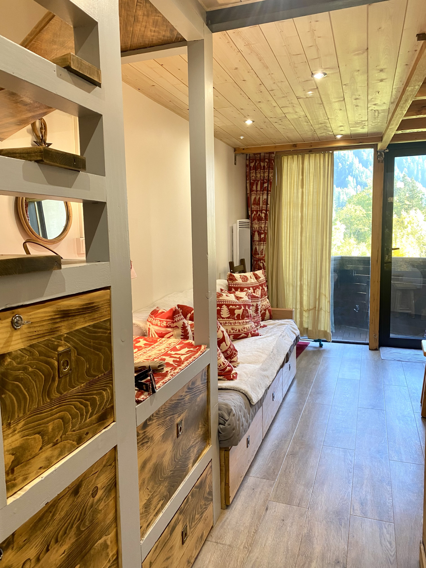 Il se compose d'une entrée avec rangements, WC, espace lave-mains, cuisine ouverte sur séjour avec balcon offrant une vue imprenable sur les montagnes environnantes. À l'étage, une agréable mezzanine aménagée acceuille deux chambres et une salle de bains, parfait pour des séjours en famille ou entre amis.