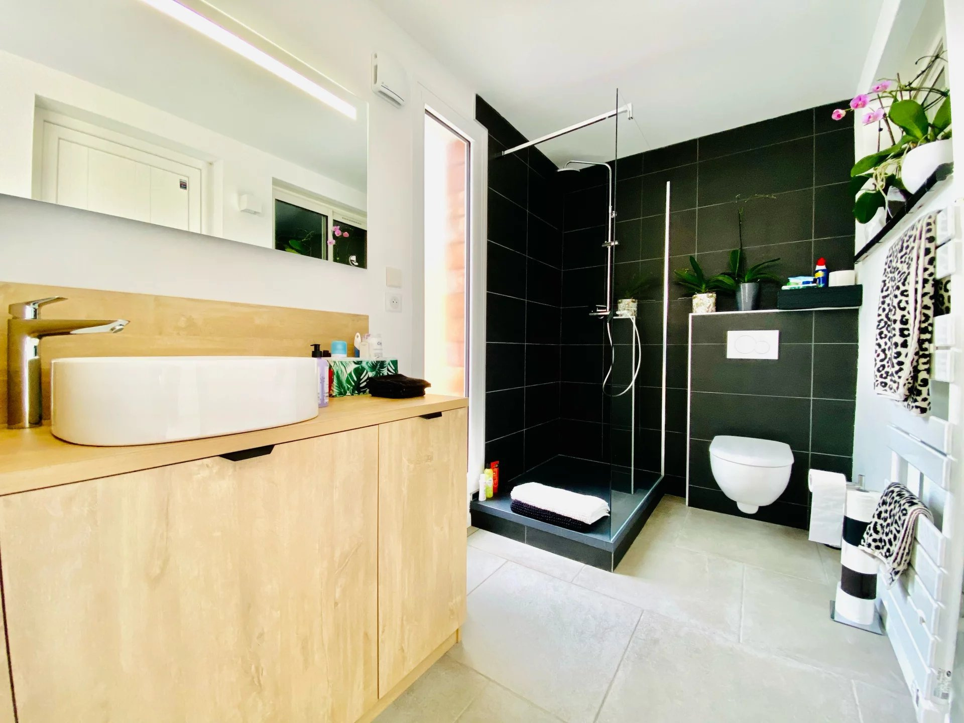 Cette pièce saura vous séduire avec sa hauteur sous plafond, la climatisation et sa cuisine haut de gamme entièrement équipée. Côté pratique : le cellier/buanderie attenant et donnant également accès au double garage avec porte sectionnelle de 5m de large. L'espace nuit vous offre 3 belles chambres, chacune ayant sa salle d'eau / de bains et un accès à sa terrasse.