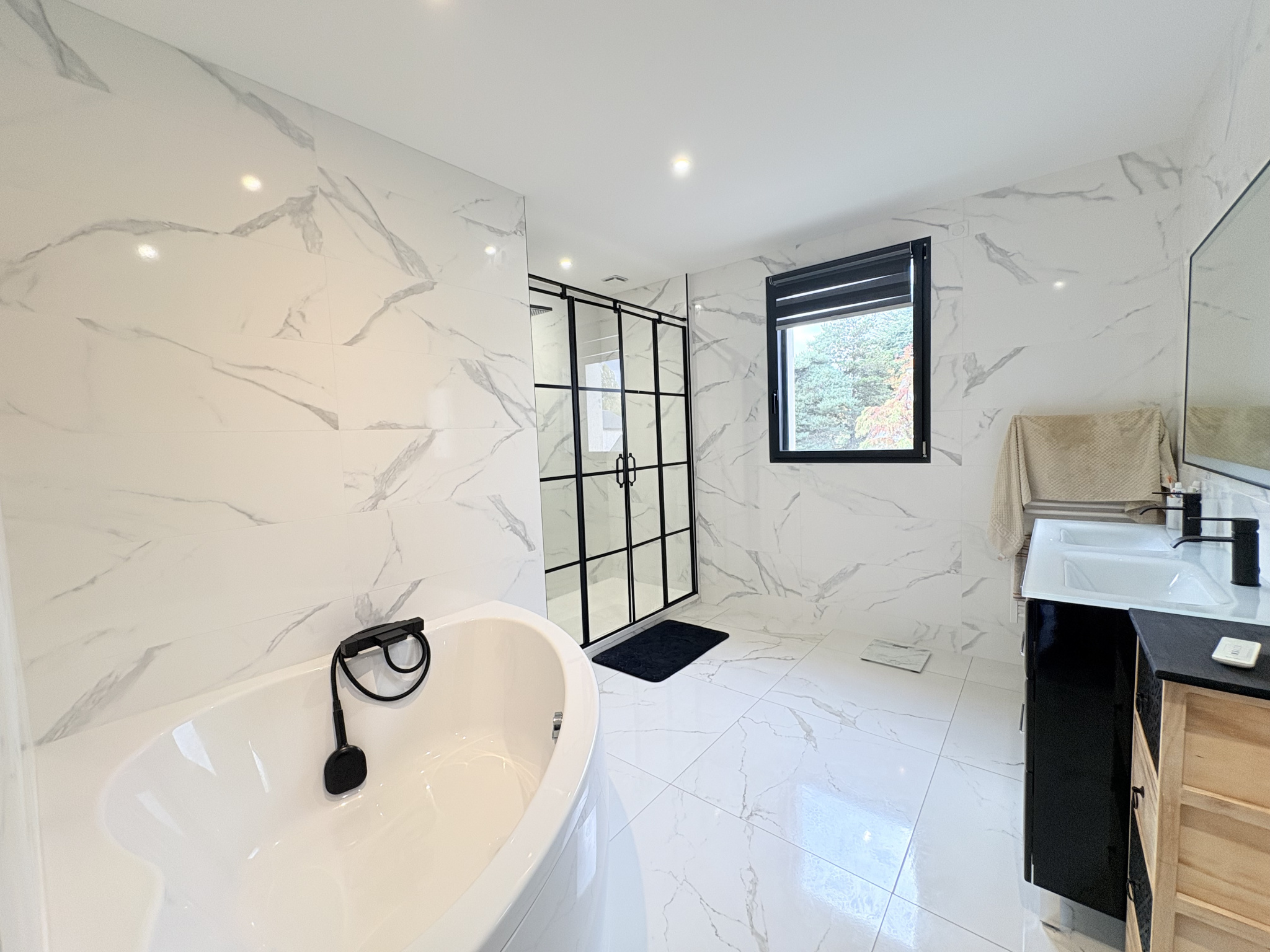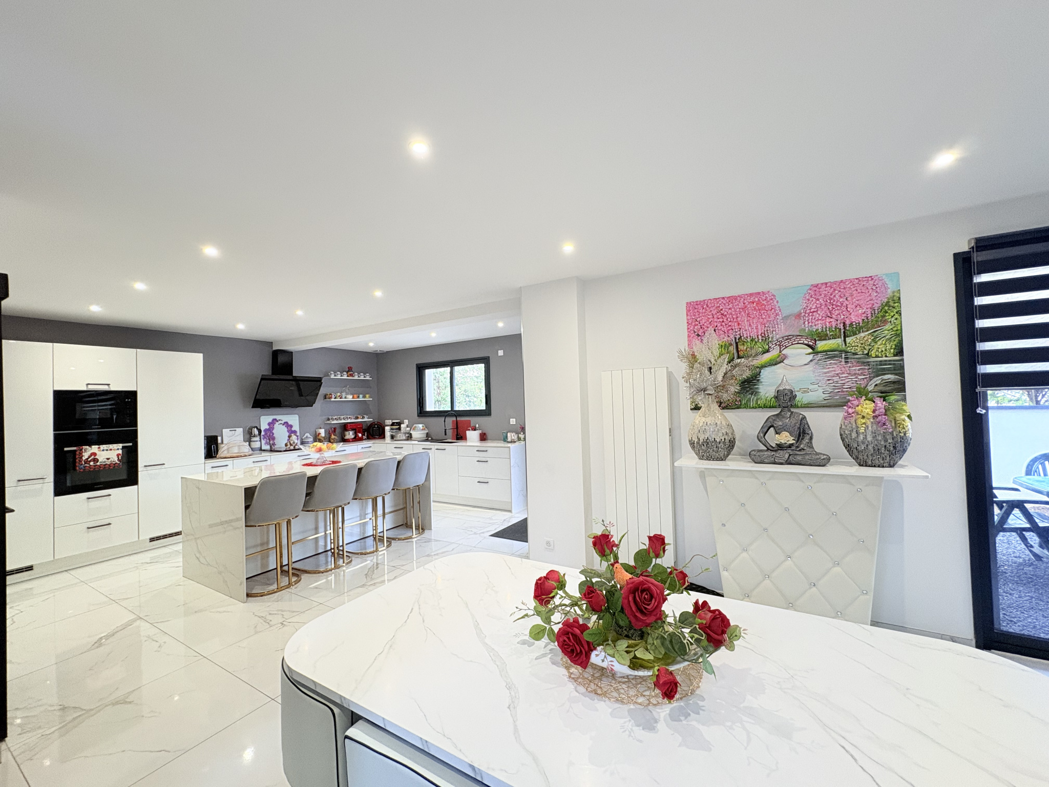 Dès l'entrée, vous serez séduit par la qualité des prestations et la générosité des volumes. Le rez-de-chaussée offre une somptueuse pièce de vie d'environ 60 m2, baignée de lumière grâce à de larges baies vitrées ouvrant sur une terrasse ensoleillée. La cuisine contemporaine, entièrement équipée et aménagée, s'intègre harmonieusement à l'espace. Une suite parentale de 20 m2, dotée d'un dressing sur mesure et d'une salle de bains privative, complète cet étage, ainsi qu'une buanderie et un WC indépendant.