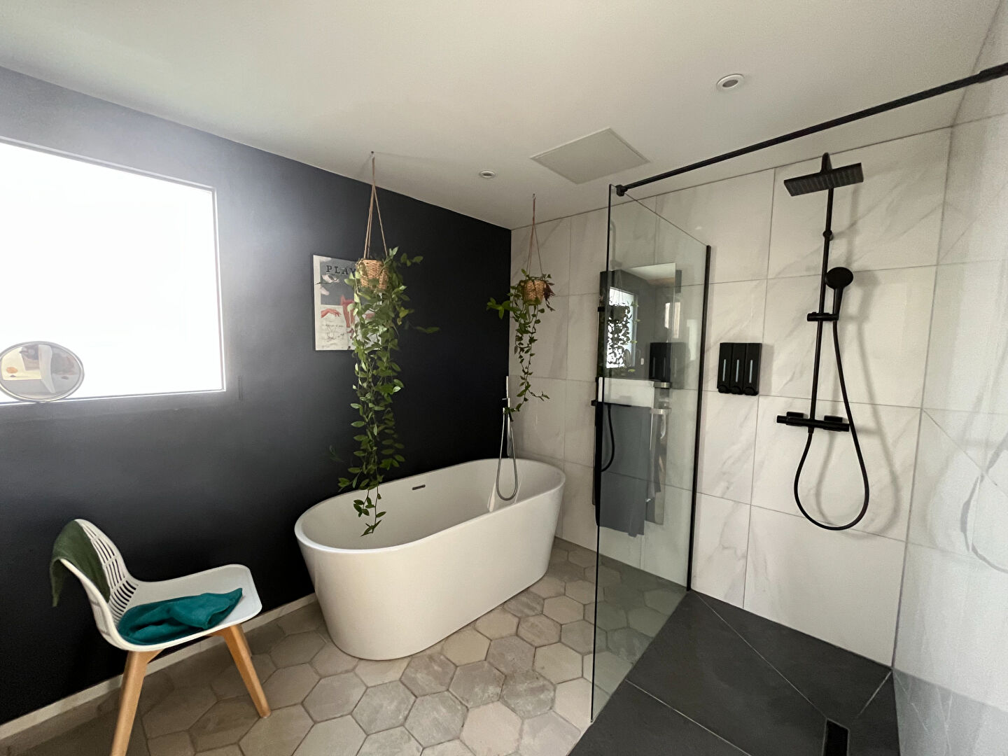 La partie résidentielle, située à l'étage, cette partie offre des volumes généreux et un grand confort pour une vie de famille. Vous y trouverez un grand séjour baigné de lumière, idéal pour la réception, ainsi que cinq chambres. Profitez d'une grande terrasse privative avec vue dégagée, parfaite pour vos moments de détente.