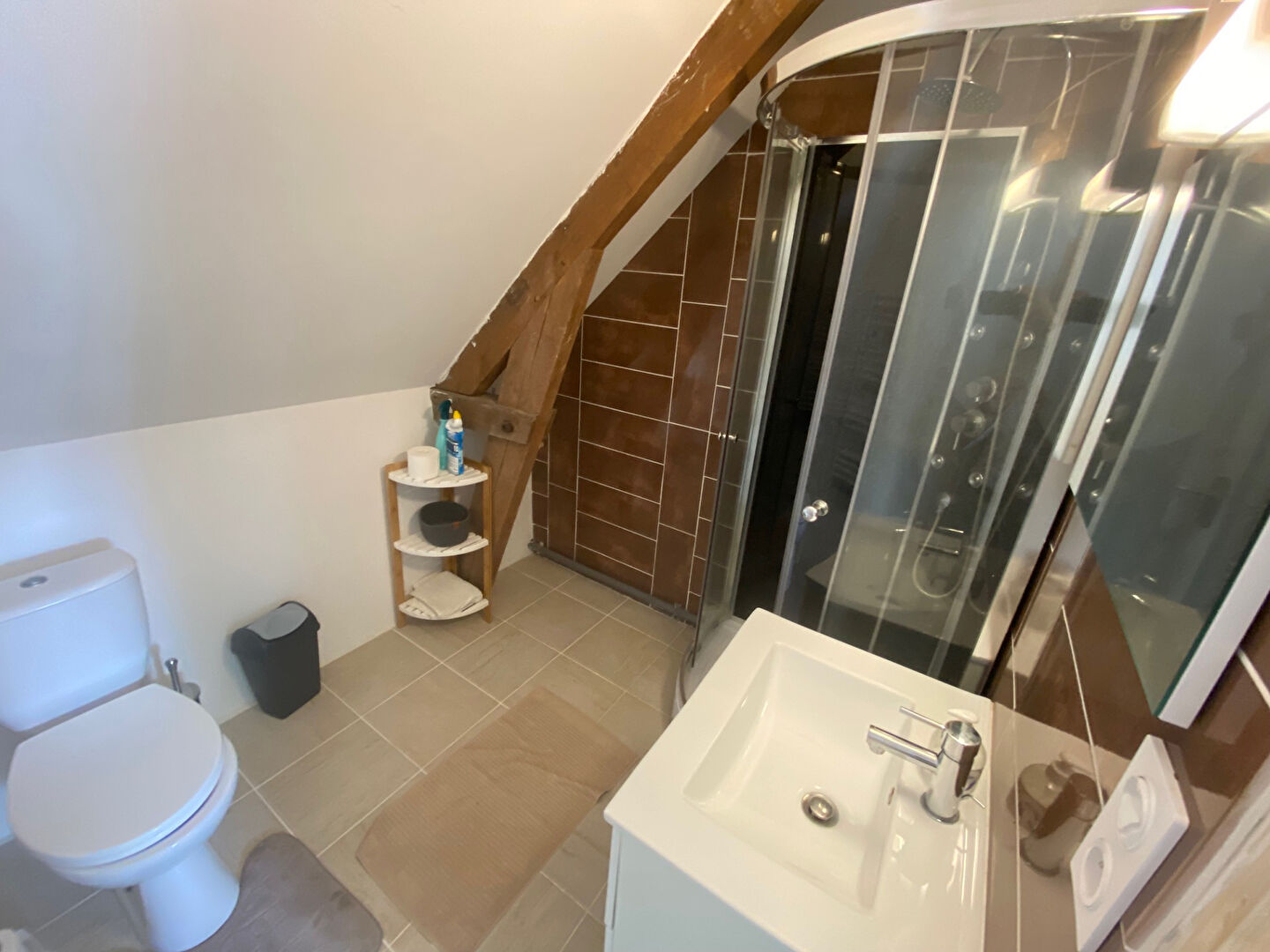 2) Un immeuble élevé en pierres, couvert en ardoises, comprenant en rez-de-chaussée, un appartement meublé composé d'une entrée, d'une cuisine séjour, d'une chambre, d'une salle de bains avec WC.