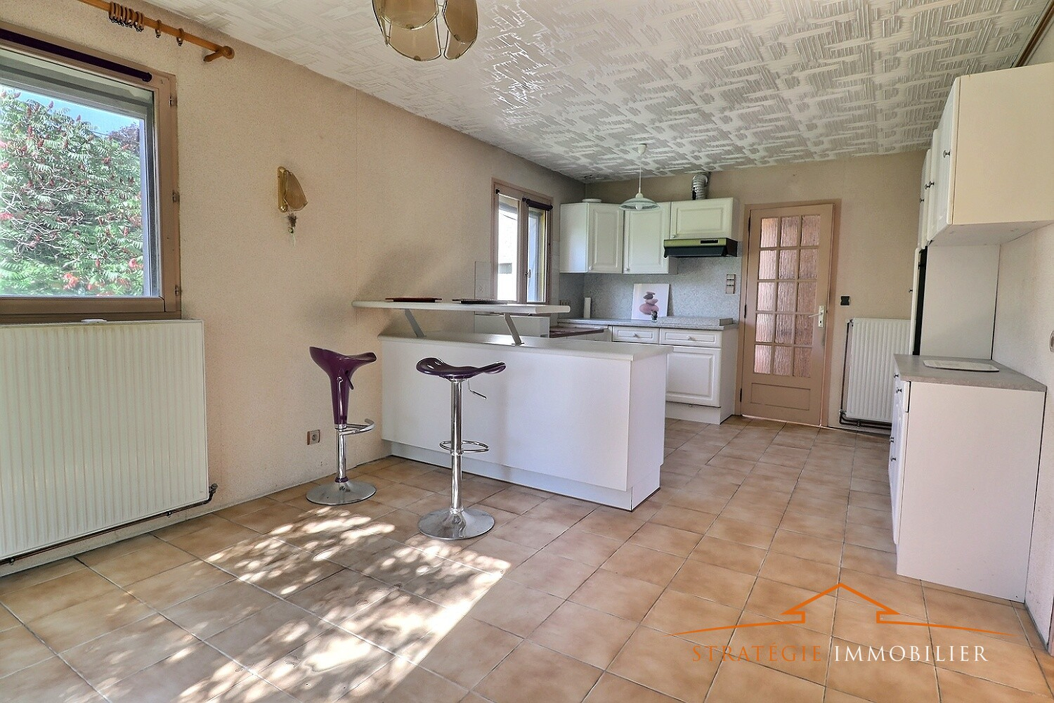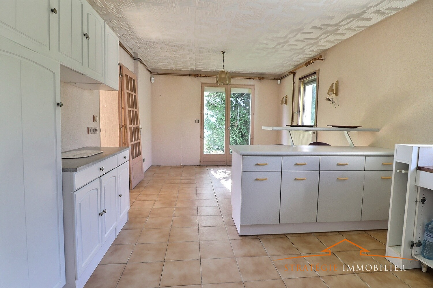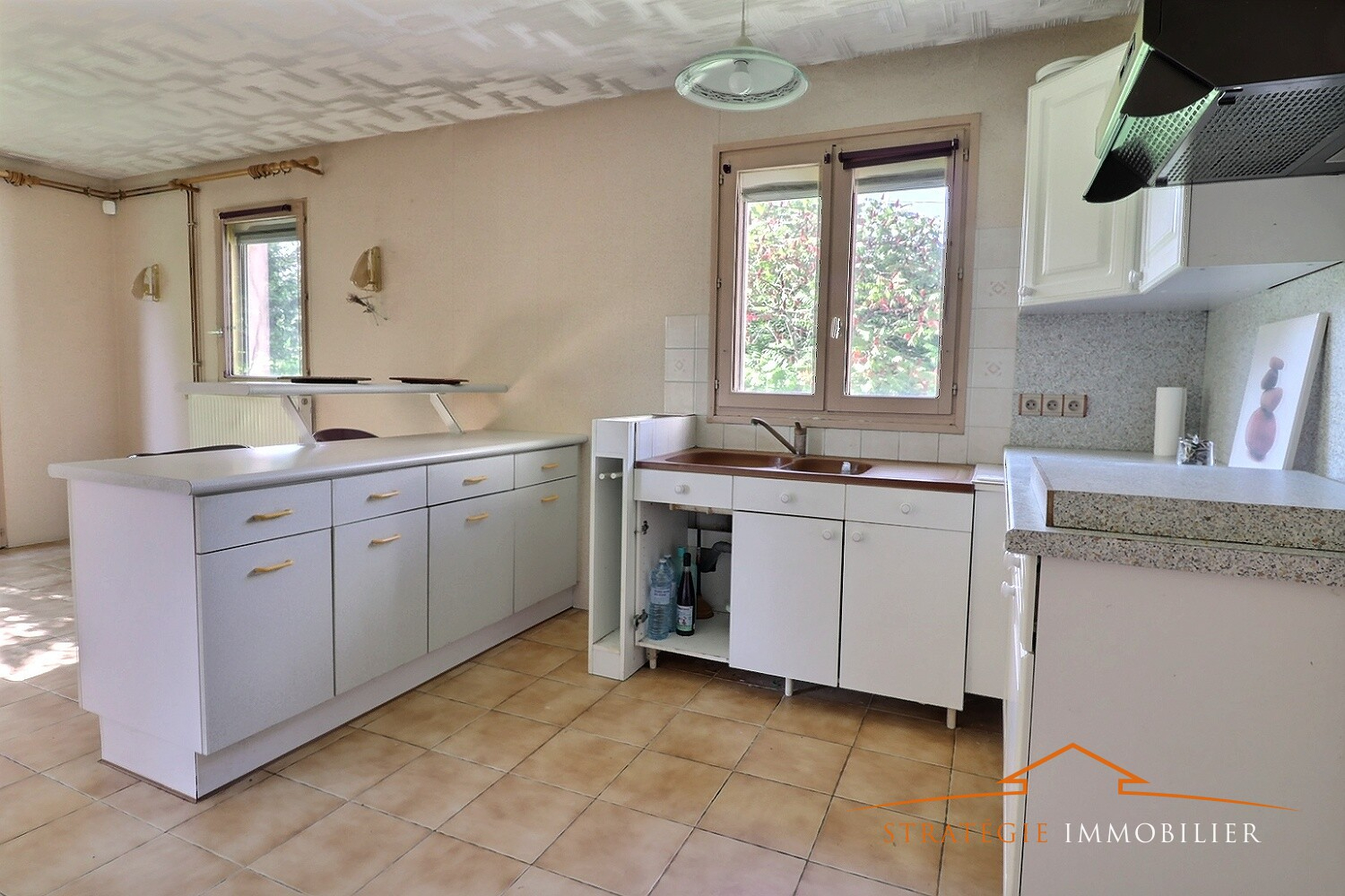 cuisine d'été permettant d'accéder à un garage-chaufferie (chaudière à granules installée en 2021), cellier à la suite.