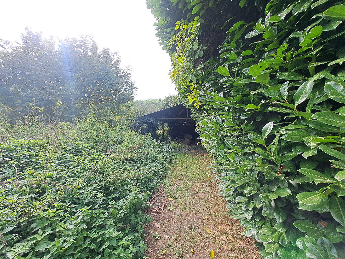 Terrain en grande parti plat de 1800 m2 non viabilisé mais égout au fond du terrain, un préau métallique pour stationner une caravane ou camion.