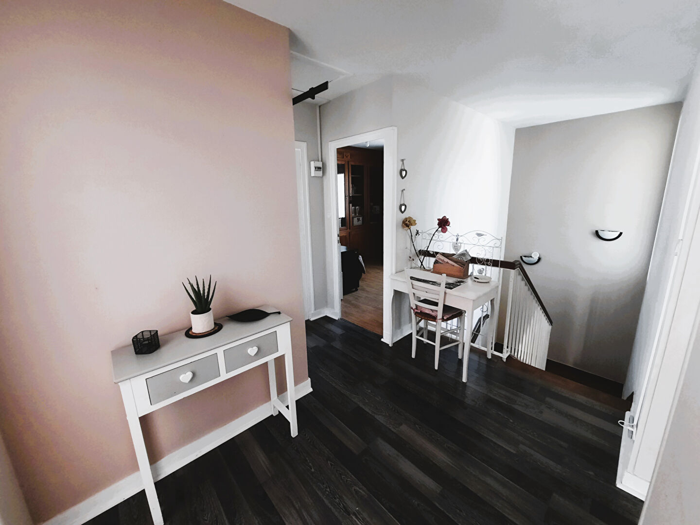 A l'étage, un palier distribue quatre chambres avec placards, une salle de bains et une salle d'eau.