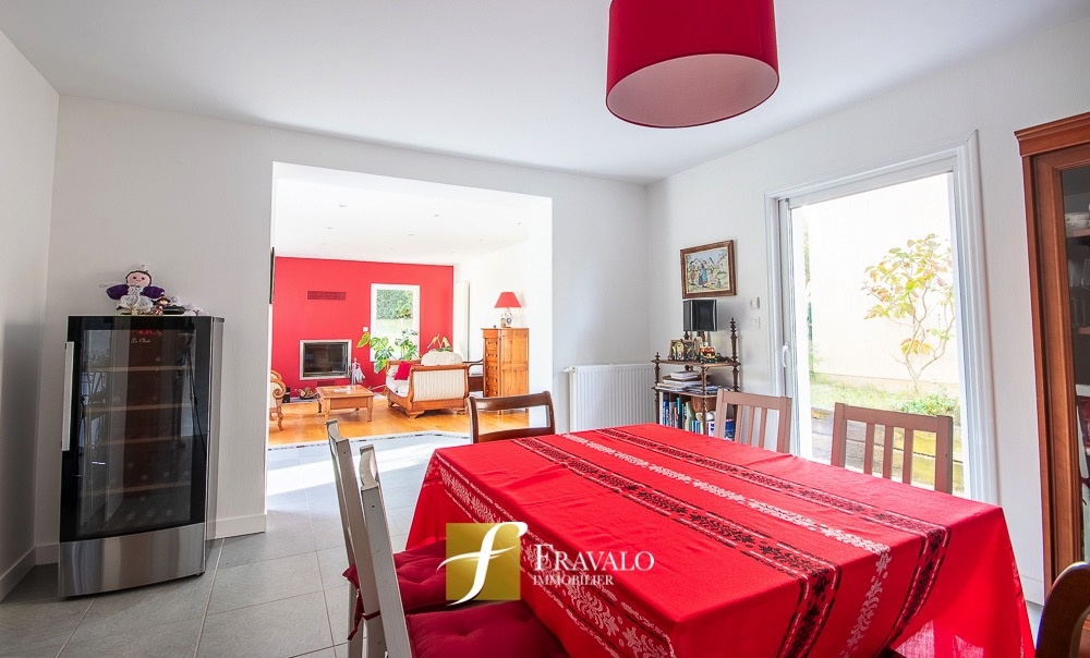 A deux pas du quartier de Beaupré Lalande à Vannes, sur la commune de Séné, venez découvrir cette maison de 154 m2 idéale pour une famille. Au rez-de-chaussée, vous trouverez une entrée avec placards, un bureau pouvant faire office de chambre (ou profession libérale), une pièce de vie avec insert, une cuisine aménagée-équipée, un wc, une suite parentale avec salle d'eau, une buanderie avec un double garage. L'étage dispose de quatre chambres, d'une salle de bains et d'un wc. Accès au port en 10 minutes, bus de ville à 300 m, commodités et écoles à 2 minutes. Estimation des coûts annuels d'énergie pour un usage standard du logement: entre 1390 EUR et 1940 EUR (abonnement compris). Les informations sur les risques auxquels ce bien est exposé sont disponibles sur le site Géorisques : georisques.gouv.fr
