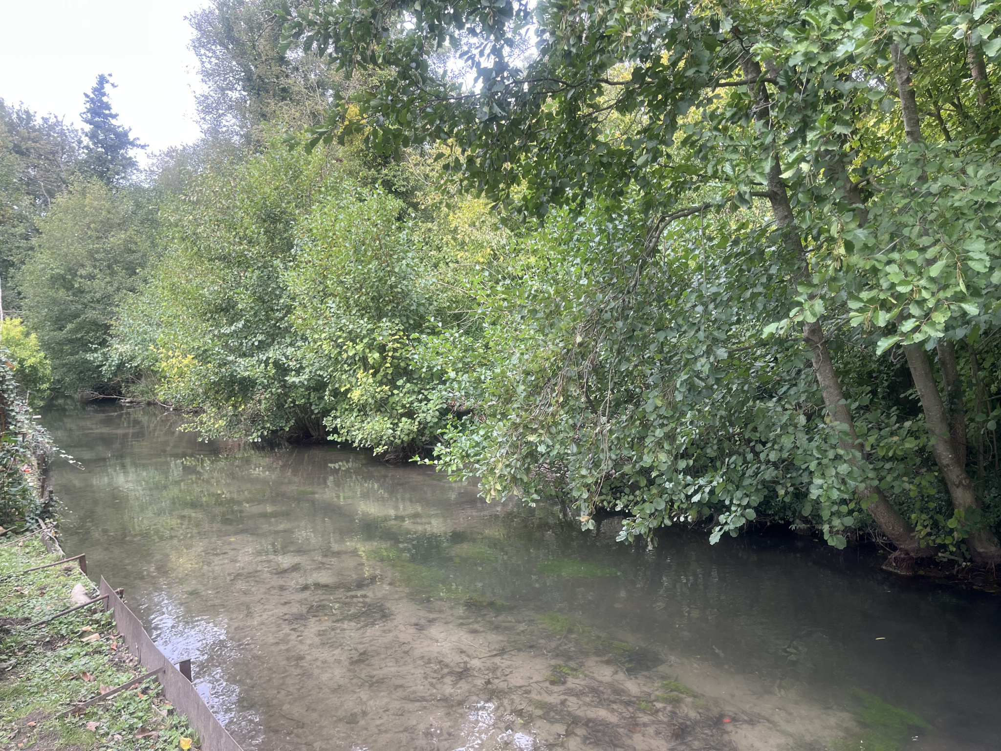 A l'extérieur: Bâtiment avec garage, buanderie, pigeonnier, cave et autre bâtiment sur 600 m2 de pelouse avec arbres fruitiers et rivière dans le fond du terrain.