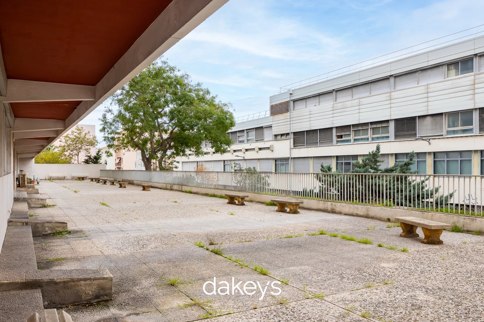 L’immeuble, bien entretenu, dispose d’une grande terrasse fermée commune offrant un agréable espace extérieur partagé entre copropriétaires.