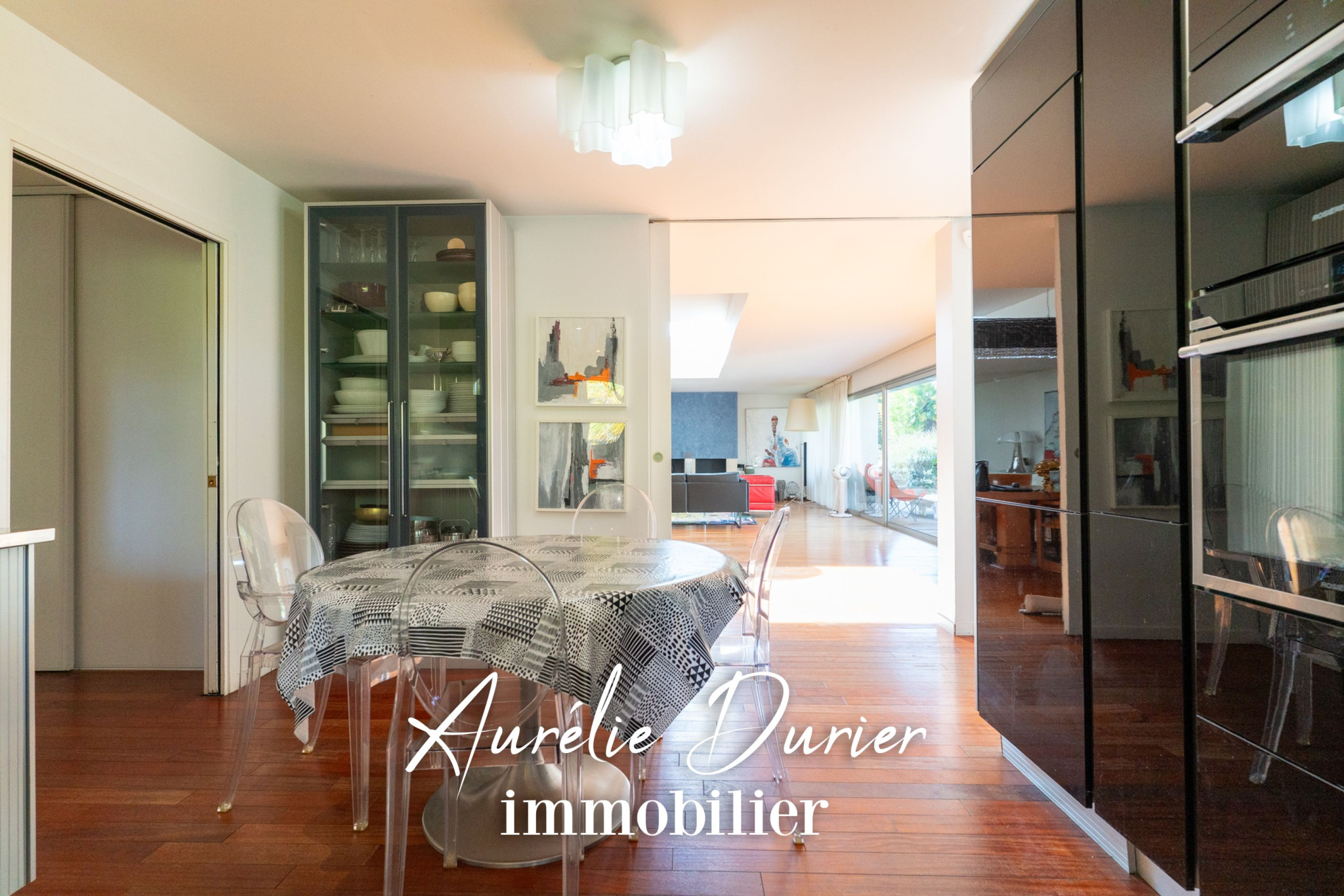 La pièce de vie de près de 100 m2 allie lumière, élégance et convivialité : un vaste salon sublimé par un puit de lumière, un parquet massif, une cheminée et une cuisine d'origine parfaitement entretenue. Chaque espace a été conçu pour offrir une vue dégagée sur le jardin arboré créant une atmosphère harmonieuse et apaisante.