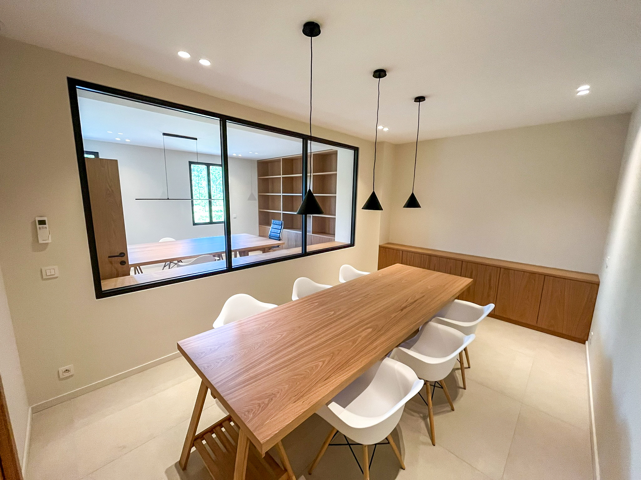 - Au deuxième étage = 2 autres espaces de travail de 82 m2 chacun et identiques dans la distibution des pièces comprenant 3 bureaux- 1 salle de réunion- cuisine - sanitaires -loggia de 8.5m2.