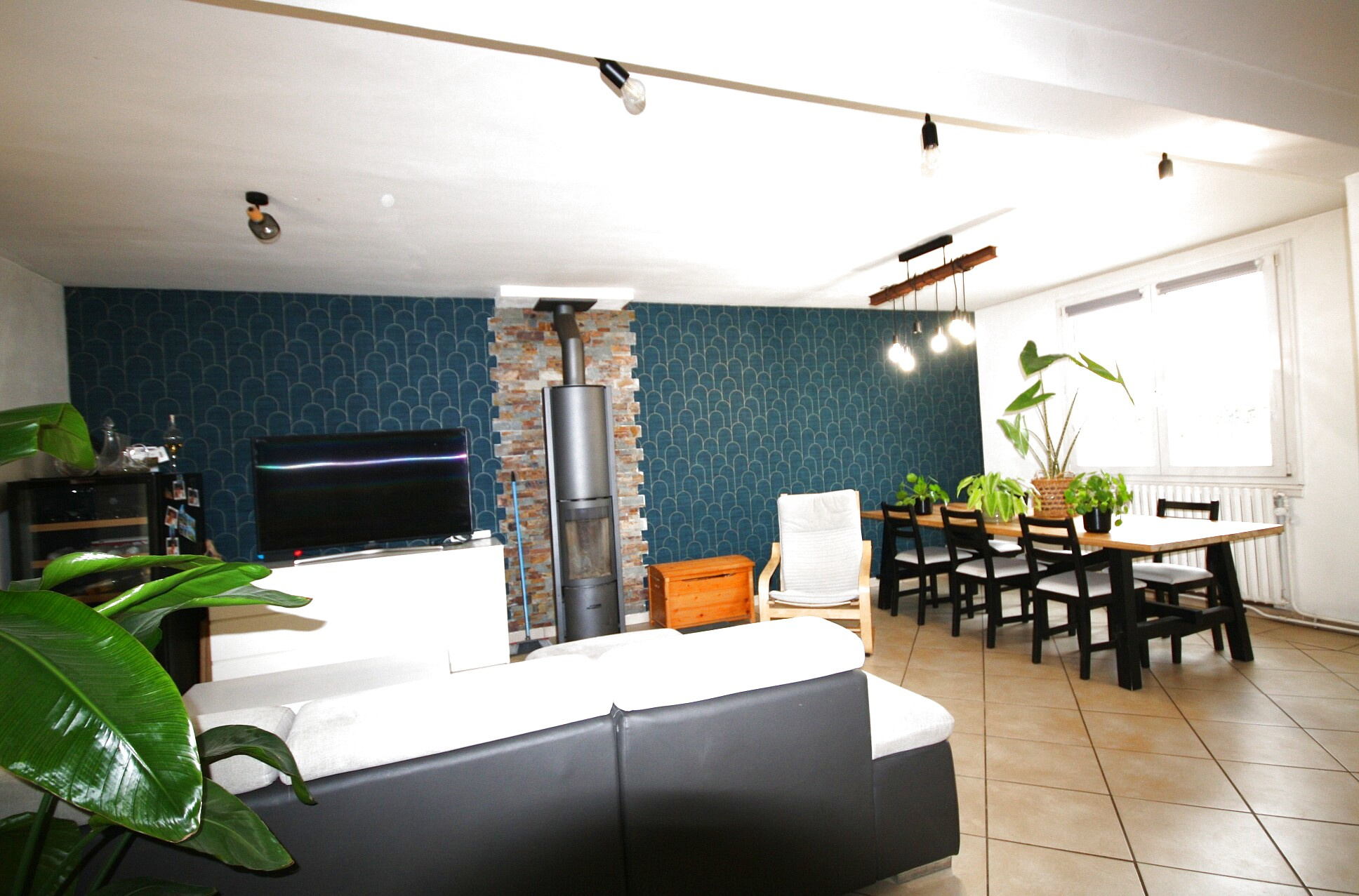 Vous serez séduit dés l'entrée par une agréable pièce de vie lumineuse de 35m2 avec un poêle à bois parfait pour les soirées d'hiver.