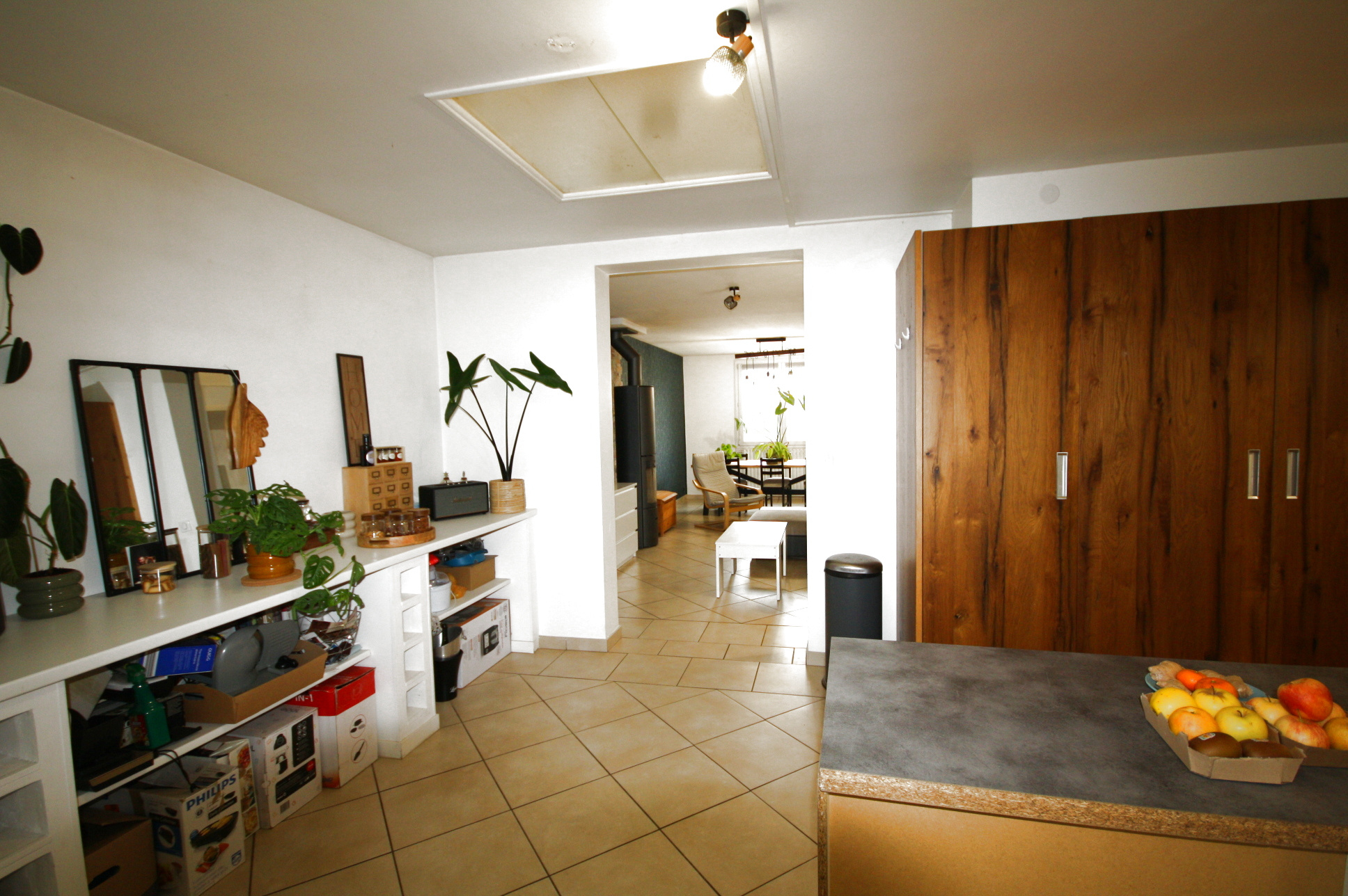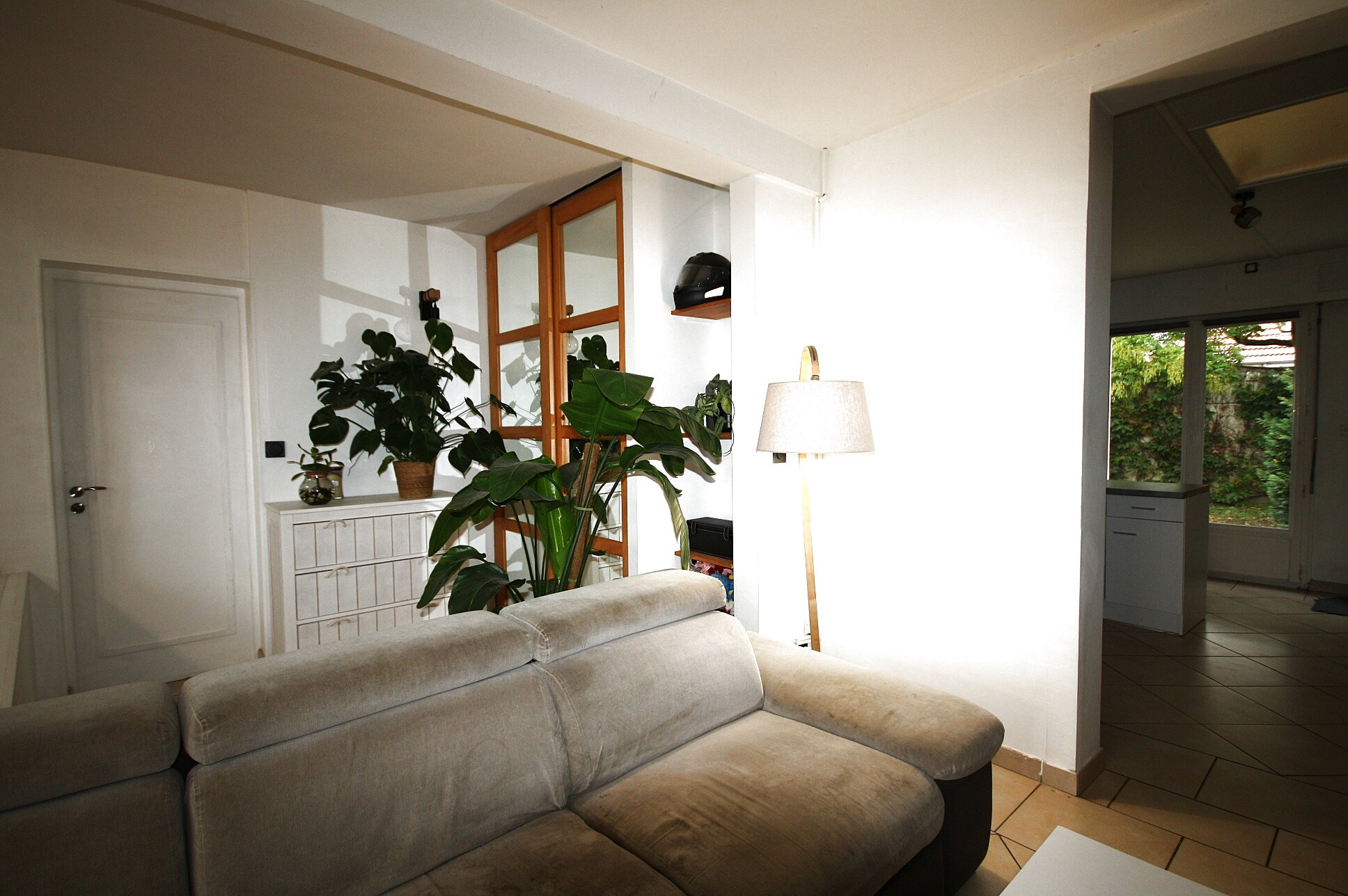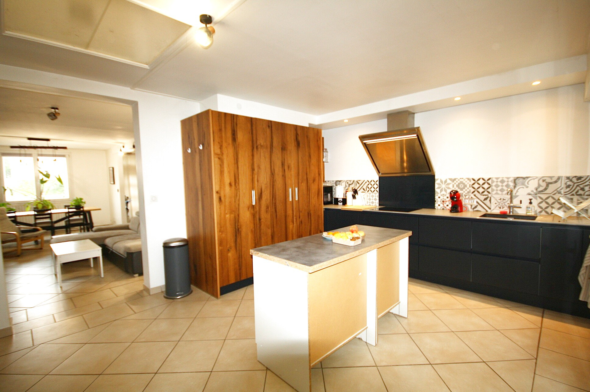 La grande cuisine conviviale, s'ouvre largement sur le séjour et sur le jardin de 81m2 arboré et sans vis à vis.