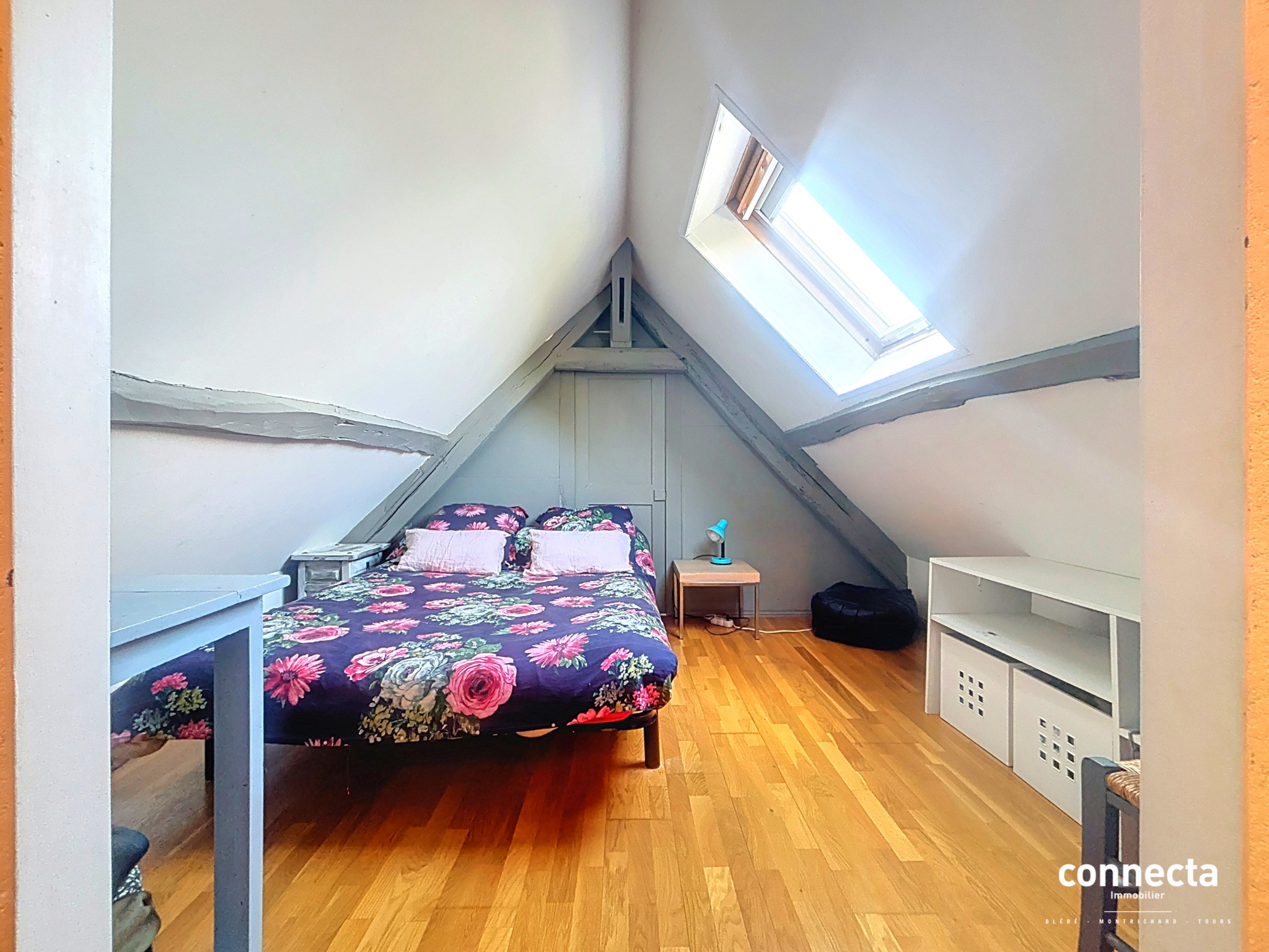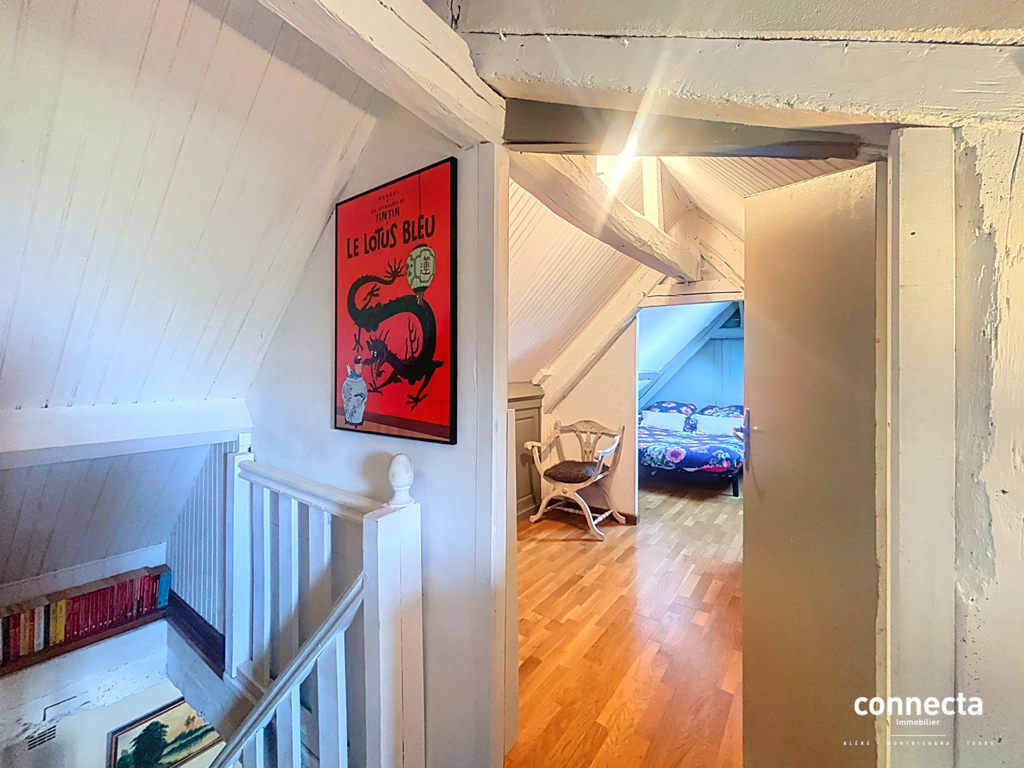À l'étage : palier desservant deux chambres mansardées, pleines de caractère.