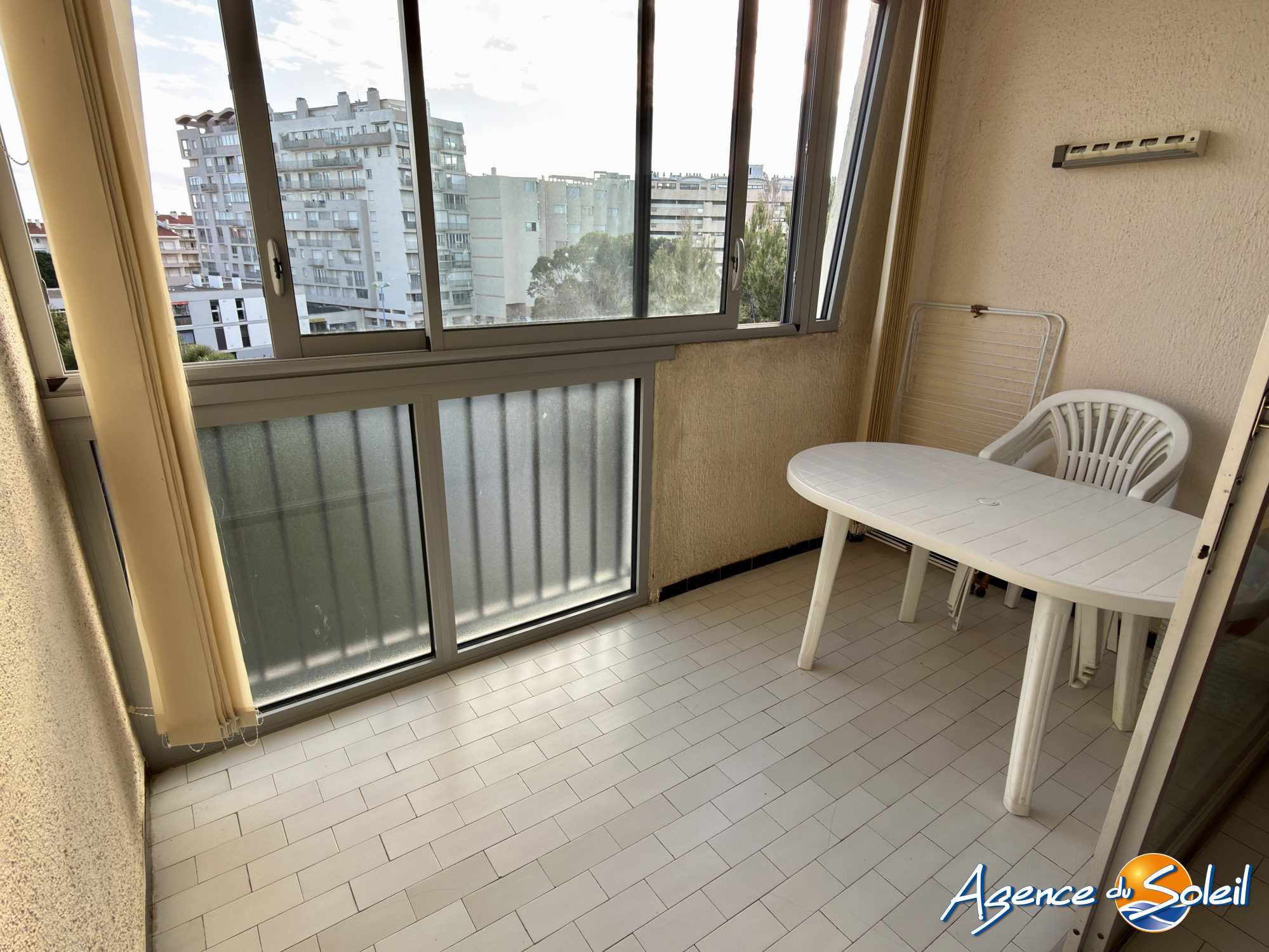 L'appartement se compose d'un hall d'entrée avec rangement, d'un séjour lumineux de 18 m² avec coin cuisine et climatisation réversible, prolongé par une loggia fermée de 6 m² exposée Est, offrant une vue dégagée avec aperçu mer.