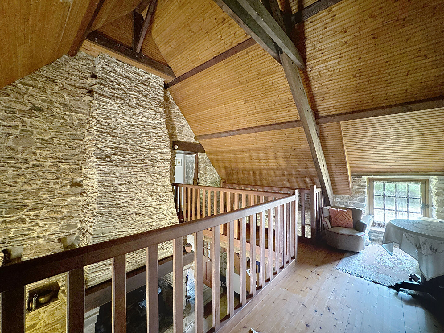 Entrée avec placard, wc, Cuisine indépendante, Séjour/Salon de 60 m2 avec cheminée (foyer ouvert), poutres apparentes, et murs pierres.