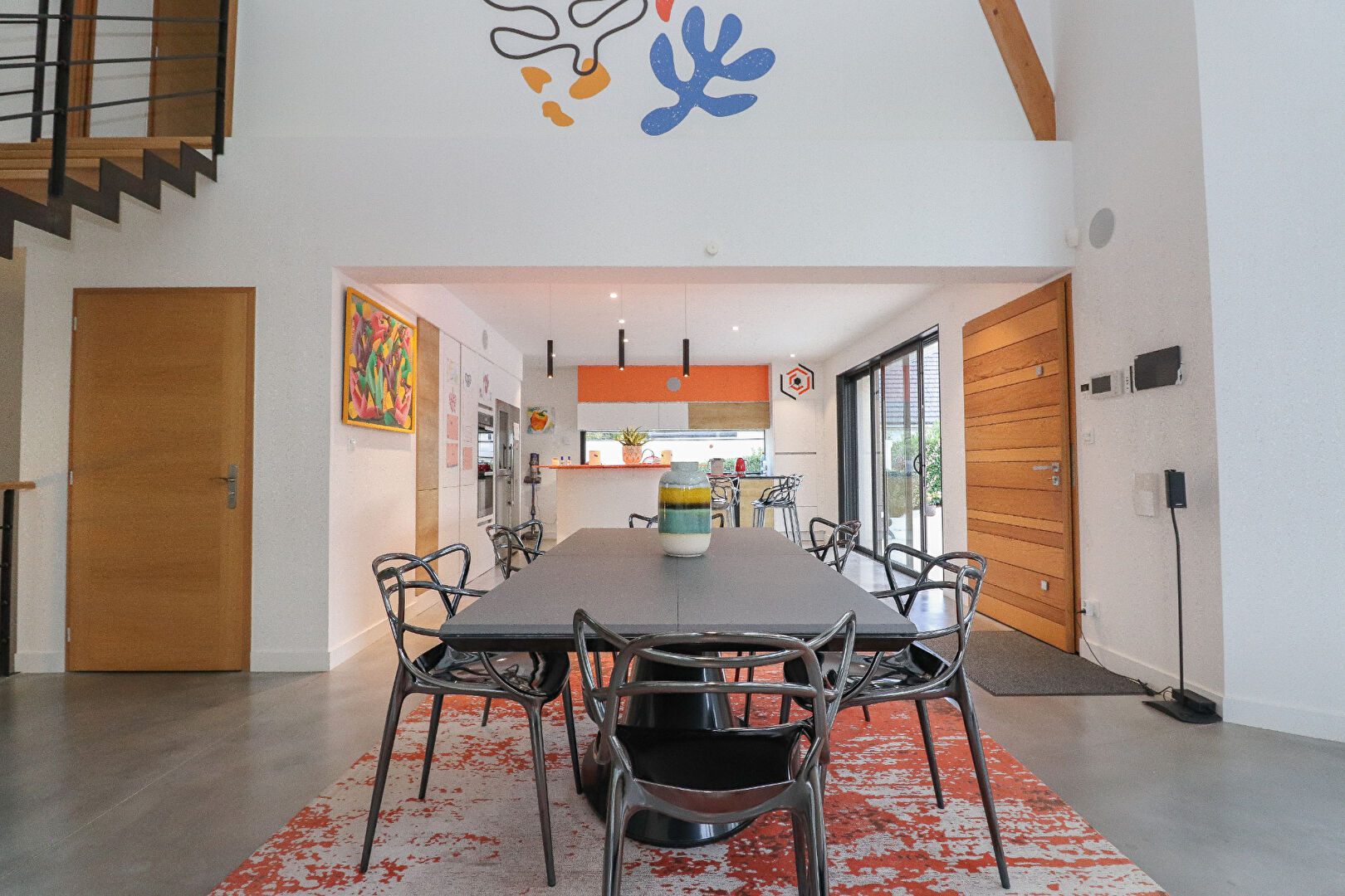 La pièce de vie principale, baignée de lumière grâce à de larges ouvertures sur la nature, développe plus de 80 m² et accueille un vaste salon, une salle à manger et une cuisine moderne entièrement équipée.