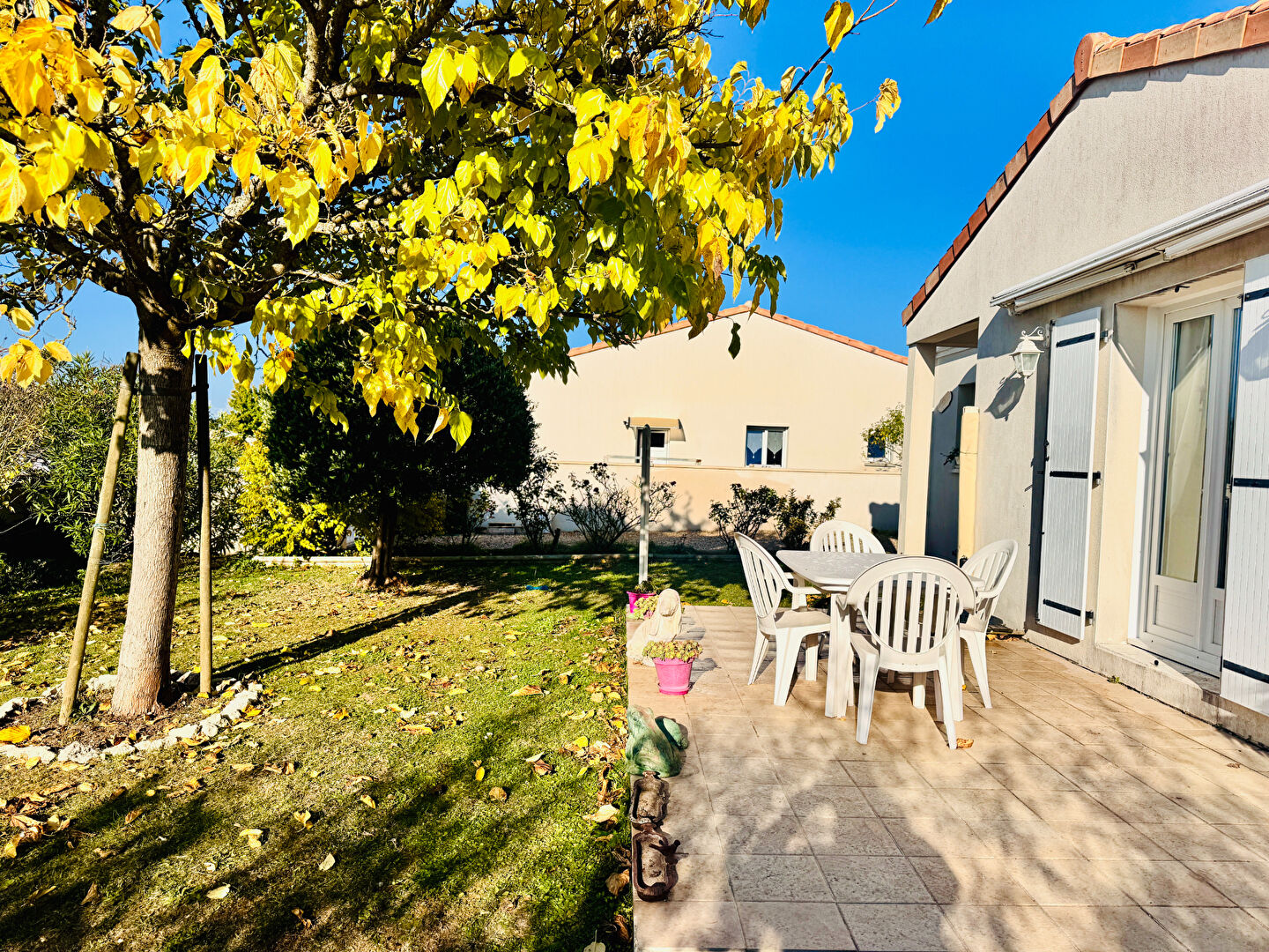 Le jardin clos, sur une parcelle de 480 m², permet de stationner plusieurs véhicules, y compris un camping-car.