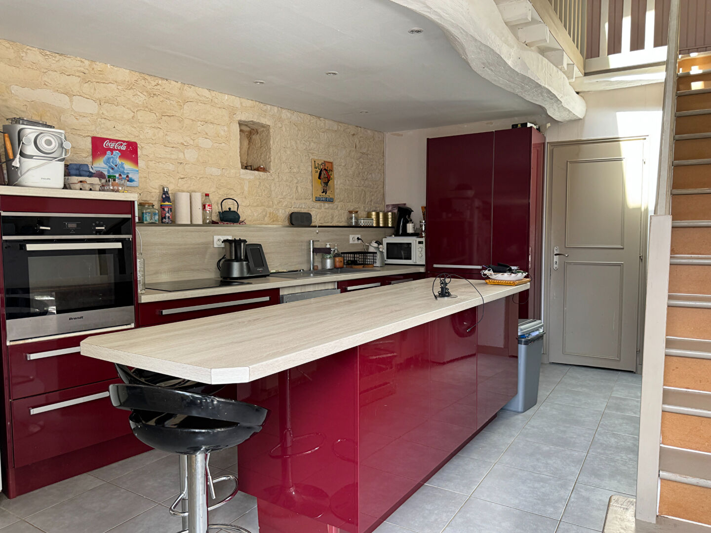 vous trouverez au rez-de-chaussée : entrée avec four à pain, cuisine aménagée et équipée, WC, salon/séjour d'environ 51 m² avec poêle à granulés, dégagement faisant office de bureau avec placard, chambre.