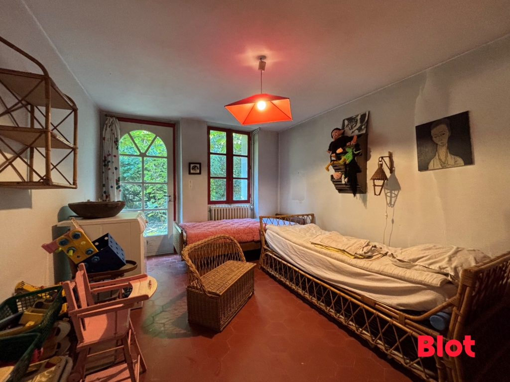 Au rez-de-chaussée : une entrée, un dégagement avec de grands placards, une grande pièce de réception chaleureuse avec une cheminée, des poutres au plafond et des vitraux. Une cuisine avec accès sur le jardin. Un couloir dessert trois chambres dont une avec point d'eau et une avec une salle d'eau privative, une salle de bains, un toilette, une lingerie et chaufferie. Une grande remise d'environ 50m², sol béton, comprenant un fruitier, la cuve à fuel, le système d'eau et une cave à vin, accessible depuis l'intérieur et l'extérieur.