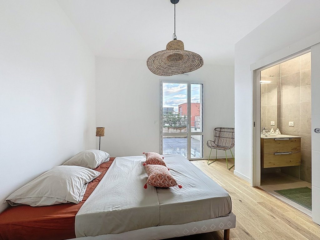 Le logement comprend trois chambres, dont une suite avec salle d'eau privative, ainsi qu'une salle de bains séparée et un WC.