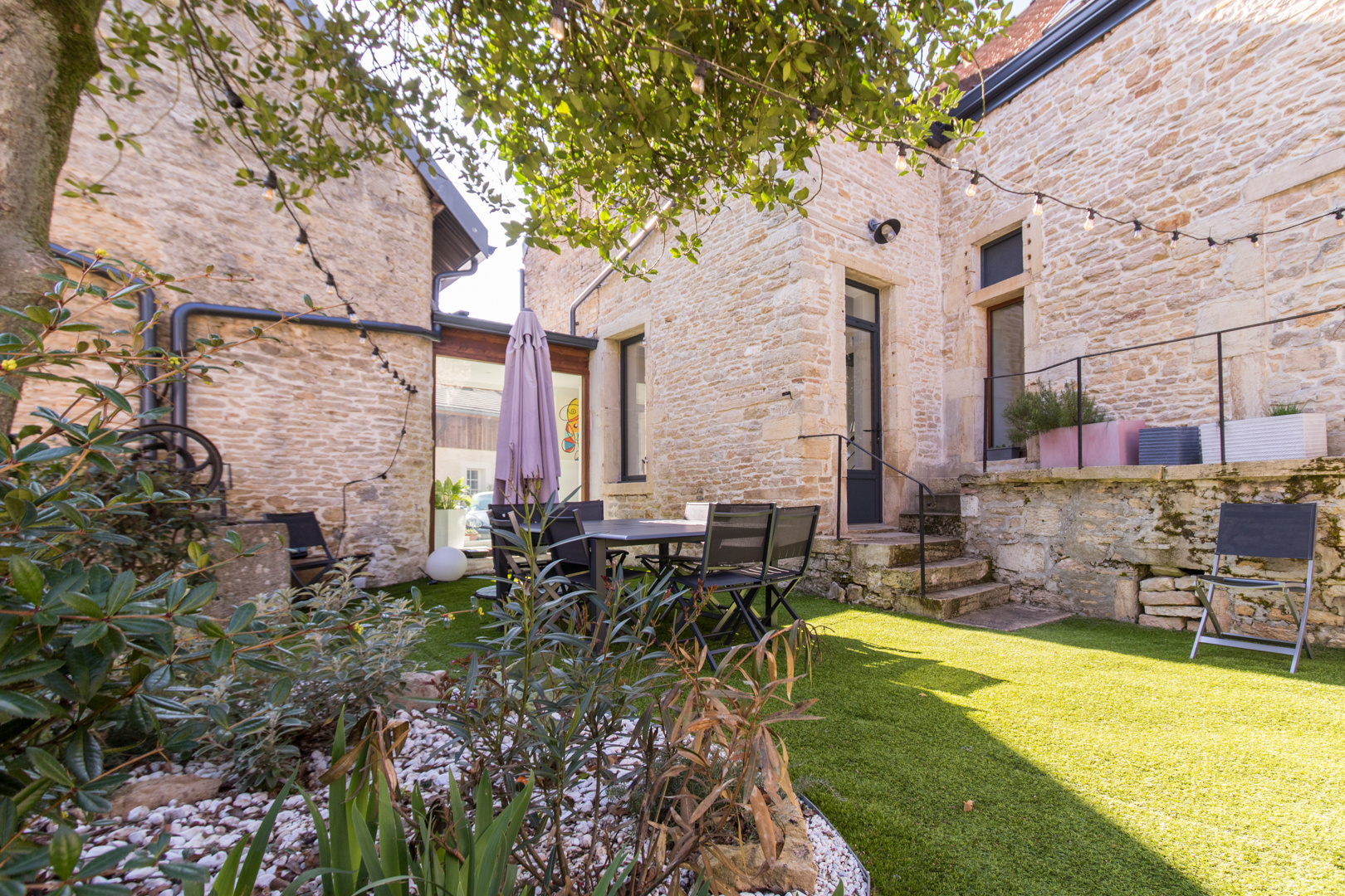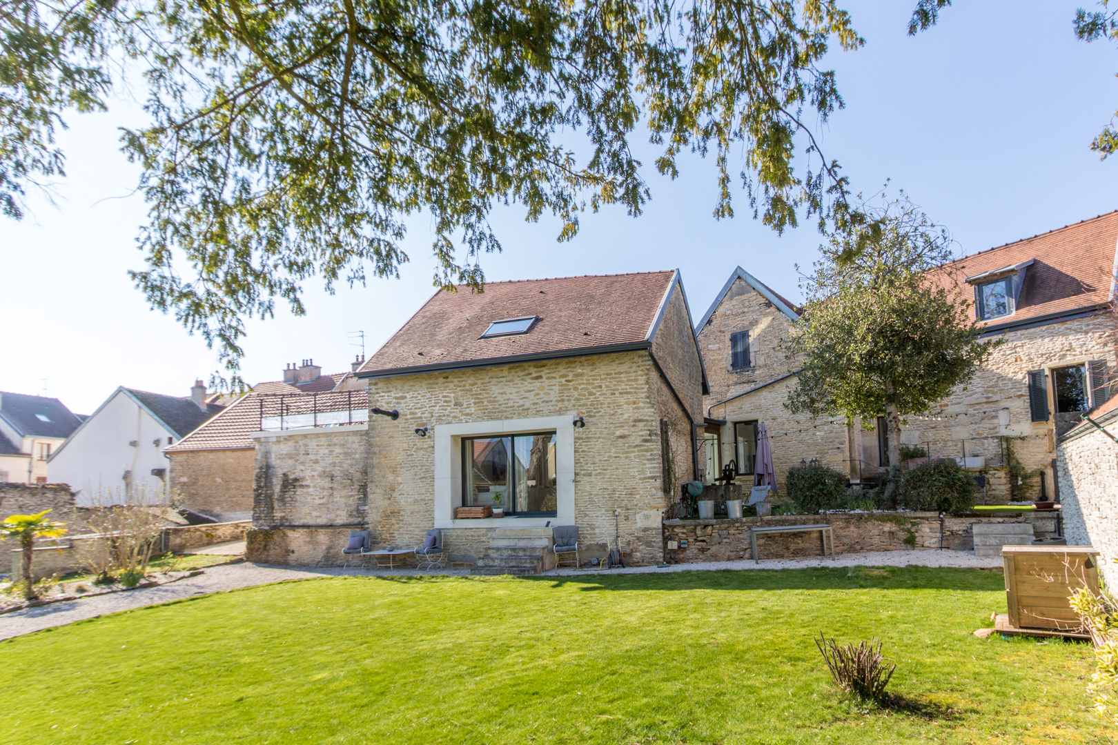 Unique. Ancienne bâtisse en pierre restaurée avec goût, d'environ 300 m2 au sol, bénéficiant d'un jardin exceptionnel au coeur du village.