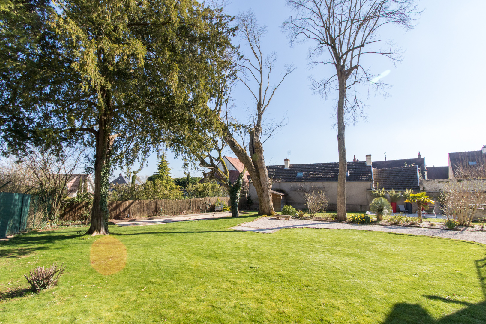 En toute intimité, le jardin agrémenté d'arbres centenaires, dispose d'une grande piscine, d'un terrain de pétanque et de plusieurs espaces propices à la détente et à la convivialité.