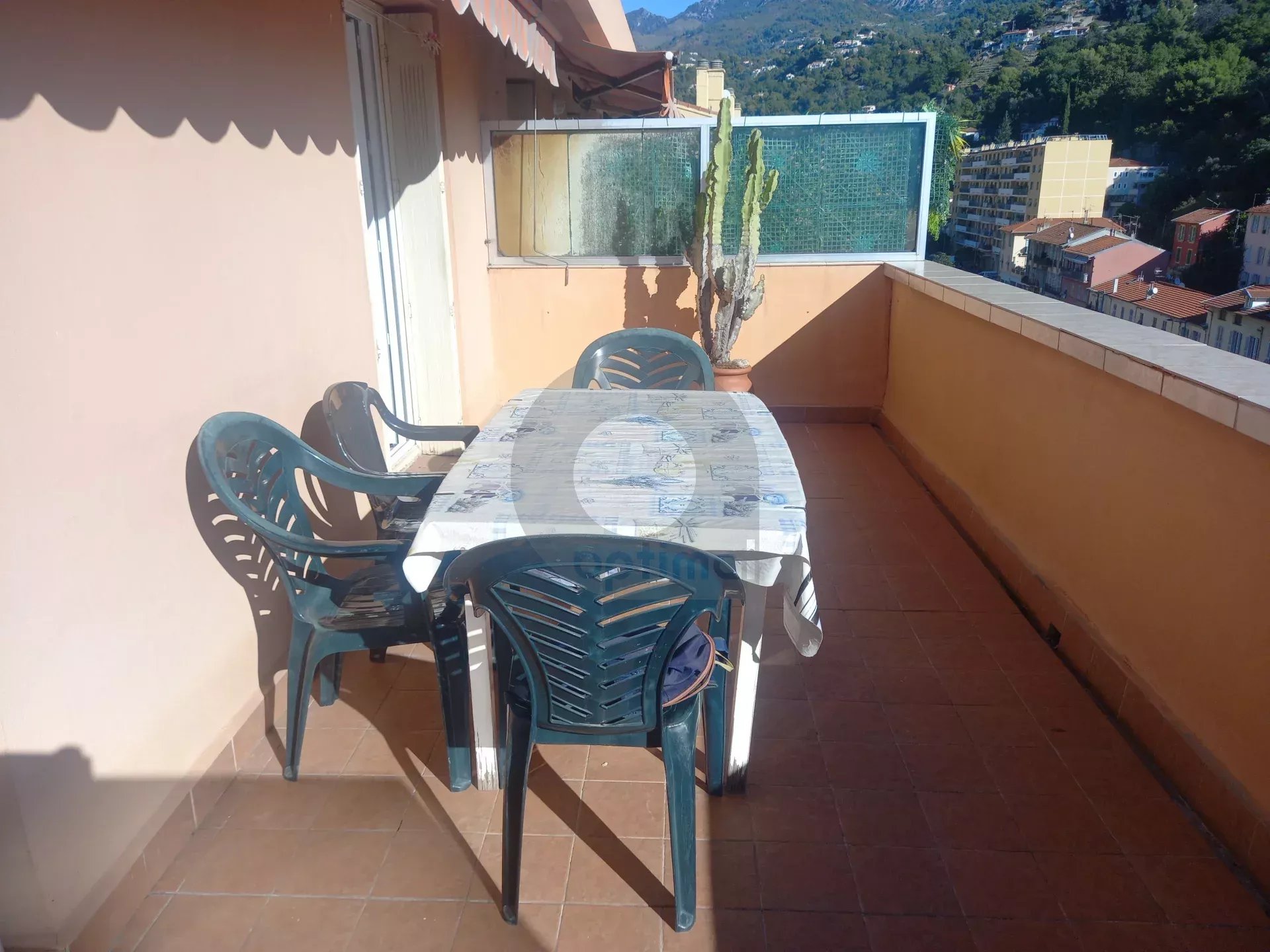 Proche centre Menton et commerces, beau 2-3 pièces en dernier étage, facilement transformable en 3 pièces, en très bon état, traversant EST-OUEST, composé d'une entrée, séjour avec salon attenant, chambre au calme, cuisine indépendante, salle de bains, WC indépendant, grande terrasse et loggia, parking privatif 2 voitures. à visiter !