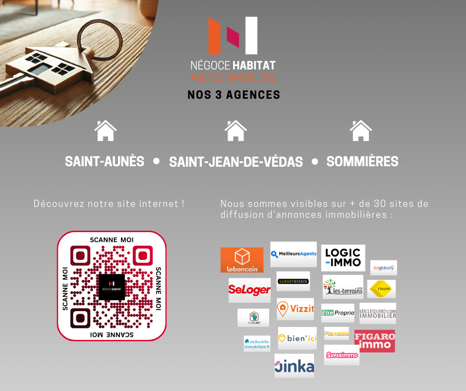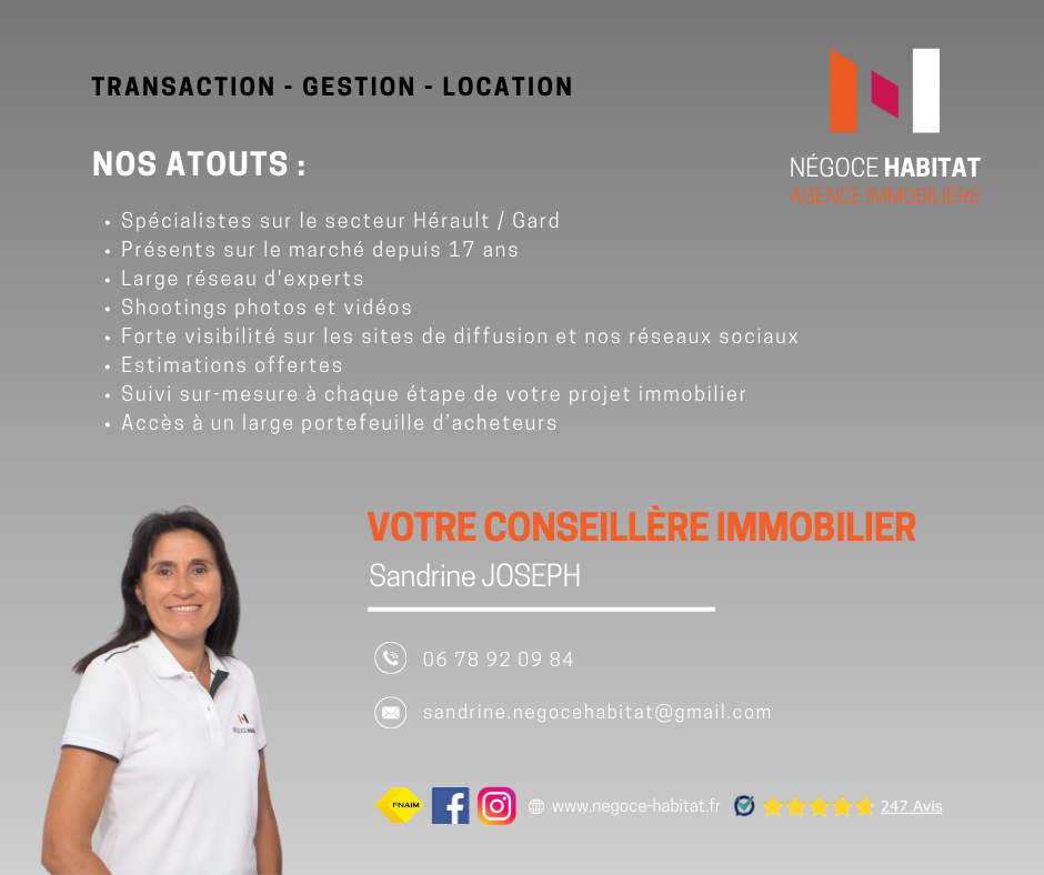 Pour organiser dès aujourd'hui une visite, contactez Mme Sandrine JOSEPH agent commercial EI, enregistré au Greffe du tribunal de commerce de MONTPELLIER sous le numéro RSAC: 98191897200010 -Tél 06.78.92.09.84. Agence immobilière NÉGOCE HABITAT, 04 99 77 11 25, 117 Av du Mas de Sapte 34130 Saint-Aunès. CPI 3402 2017 000 017 628 délivrée par la CCI de l'Hérault, SARL AFCR au capital de 5000EUR, www.negoce-habitat.com. Non détention de fonds. Les informations sur les risques auxquels ce bien est exposé sont disponibles sur : www.georisques.gouv.fr. Etablissement secondaire au 2 rue de l'Arnède à Sommières o 04.66.95.38.16.