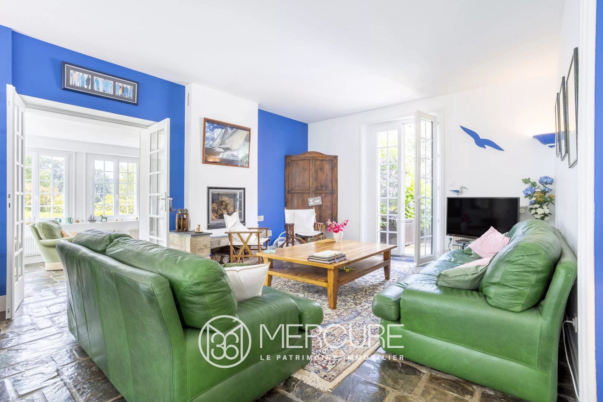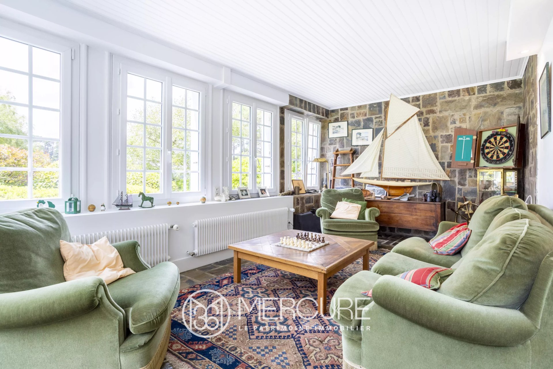La maison, de style néo breton de la fin des années 70, a été agrandie en plusieurs fois au fil des trente dernières années, dans une unité de style animée par différents alignements. Elle ouvre principalement au Sud-Ouest. Sa distribution en deux logis communicants, avec deux cuisines, deux espaces de vie et de réception, et un ensemble de 9 chambres dont certaines ont des points...