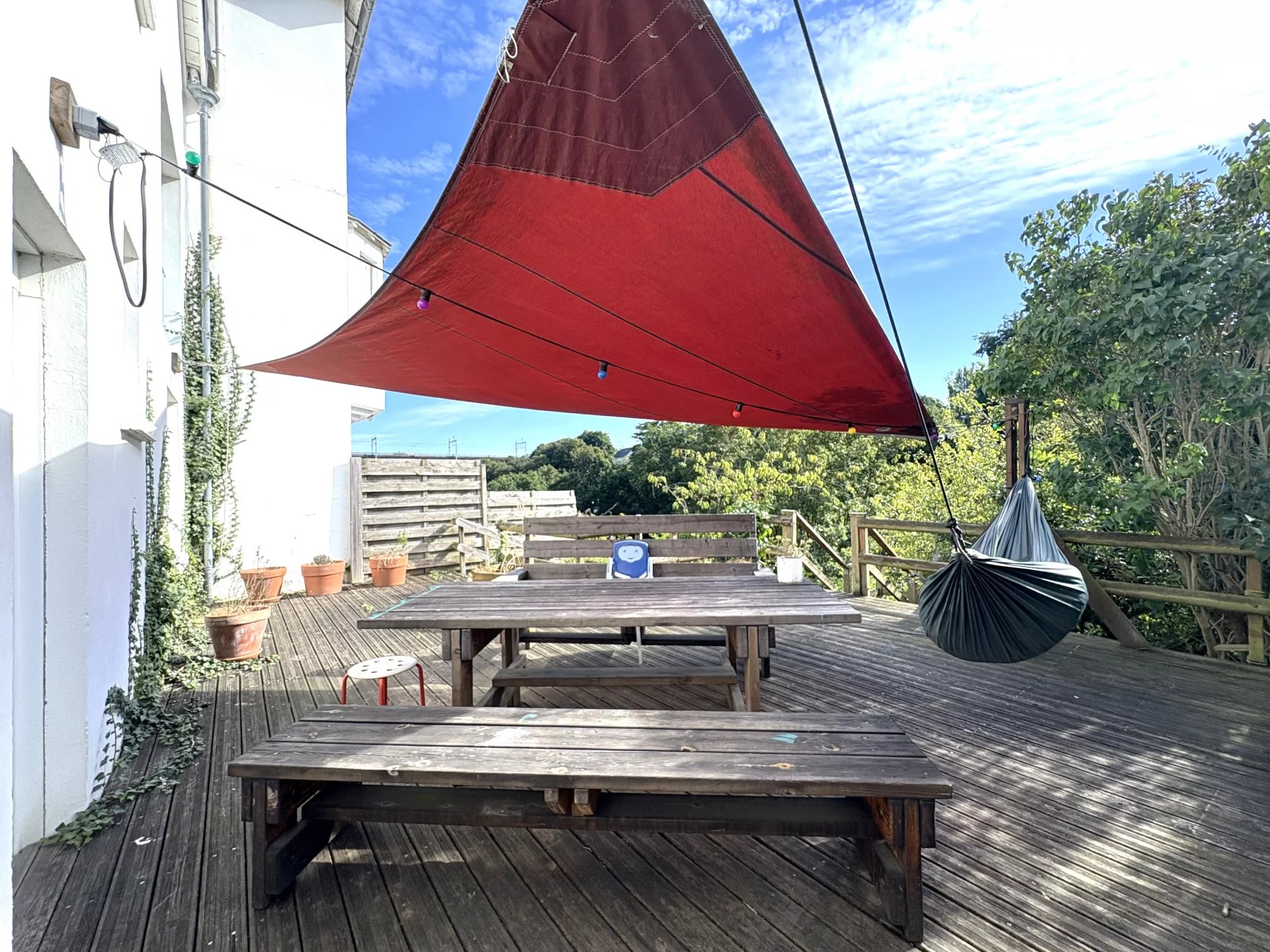 SAINT BRIEUC Robien, proche gare S.N.C.F. et 5mns centre ville, dans cadre de verdure, spacieuse maison de ville 7 P. comprenant : entrée - vaste séjour salon avec cheminée - cuisine équipée, 3 chambres, bureau, salon télé ouvrant sur terrasse de 35 m2, dressing, salle d'eau, salle de bains, W.C., vestiairie, buanderie - chaufferie - jardin en espalier - garage