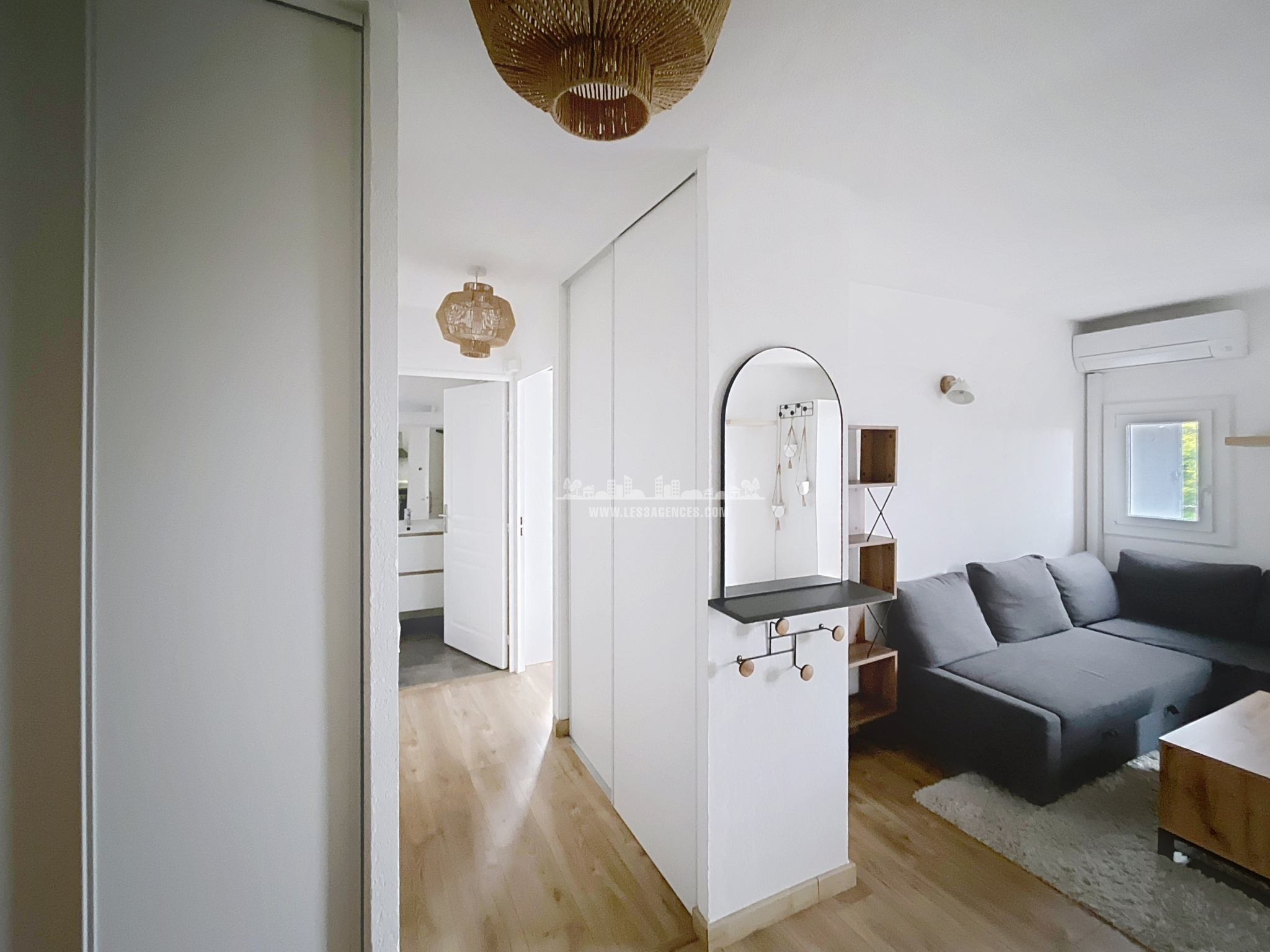 Entrée avec rangements, dégagement, WC séparés, salle de bain, une belle chambre avec rangements et balcon, lumineuse pièce de vie et cuisine équipée ouverte sur un deuxième grand balcon qui vous invite vers l'extérieur et à profiter de la vue dégagée sur les collines.