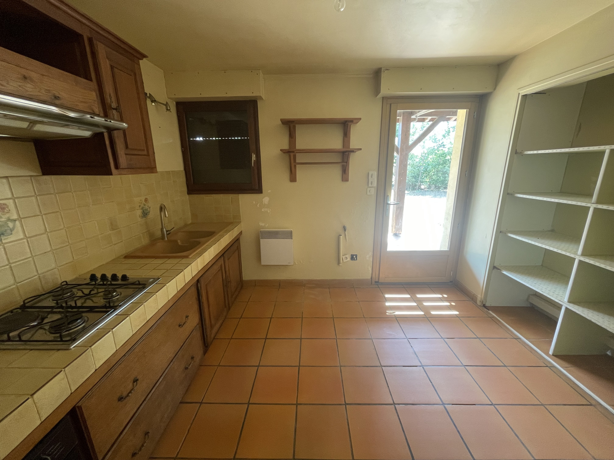 Grande partie jour de 70 m2 environ comprenant un salon déplafonné avec un insert, une cuisine séparée, un bureau, un cellier et un wc.