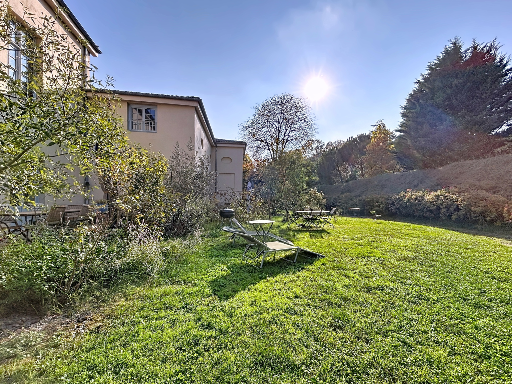 Il se compose d'une vaste pièce de vie lumineuse réunissant salon, salle à manger et cuisine ouverte entièrement équipée, le tout offrant une vue imprenable sur les jardins du château.