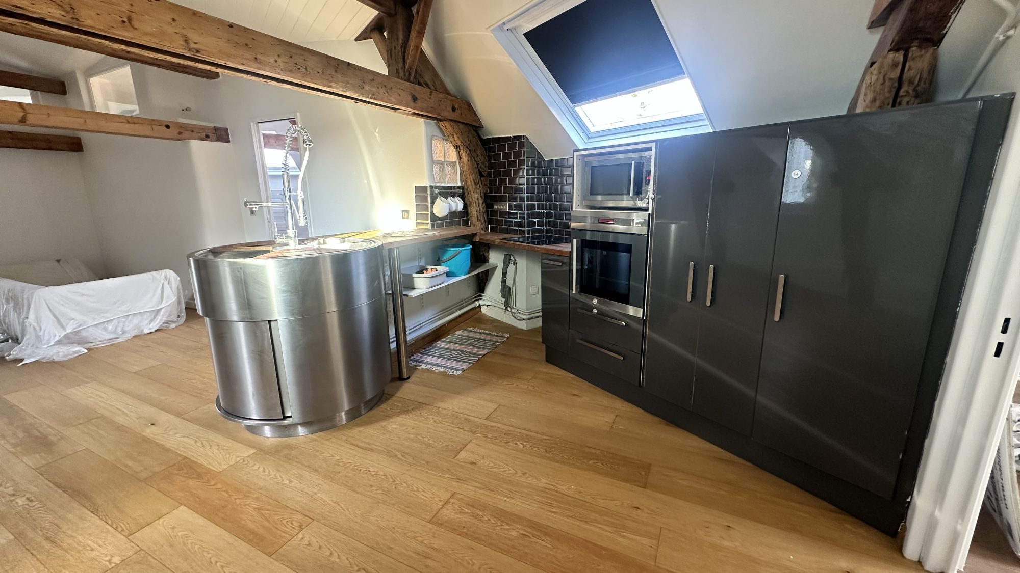 Une petite pièce pouvant être utilisée comme bureau, et un local attenant à l'appartement pour accueillir des vélos complètent l'ensemble.