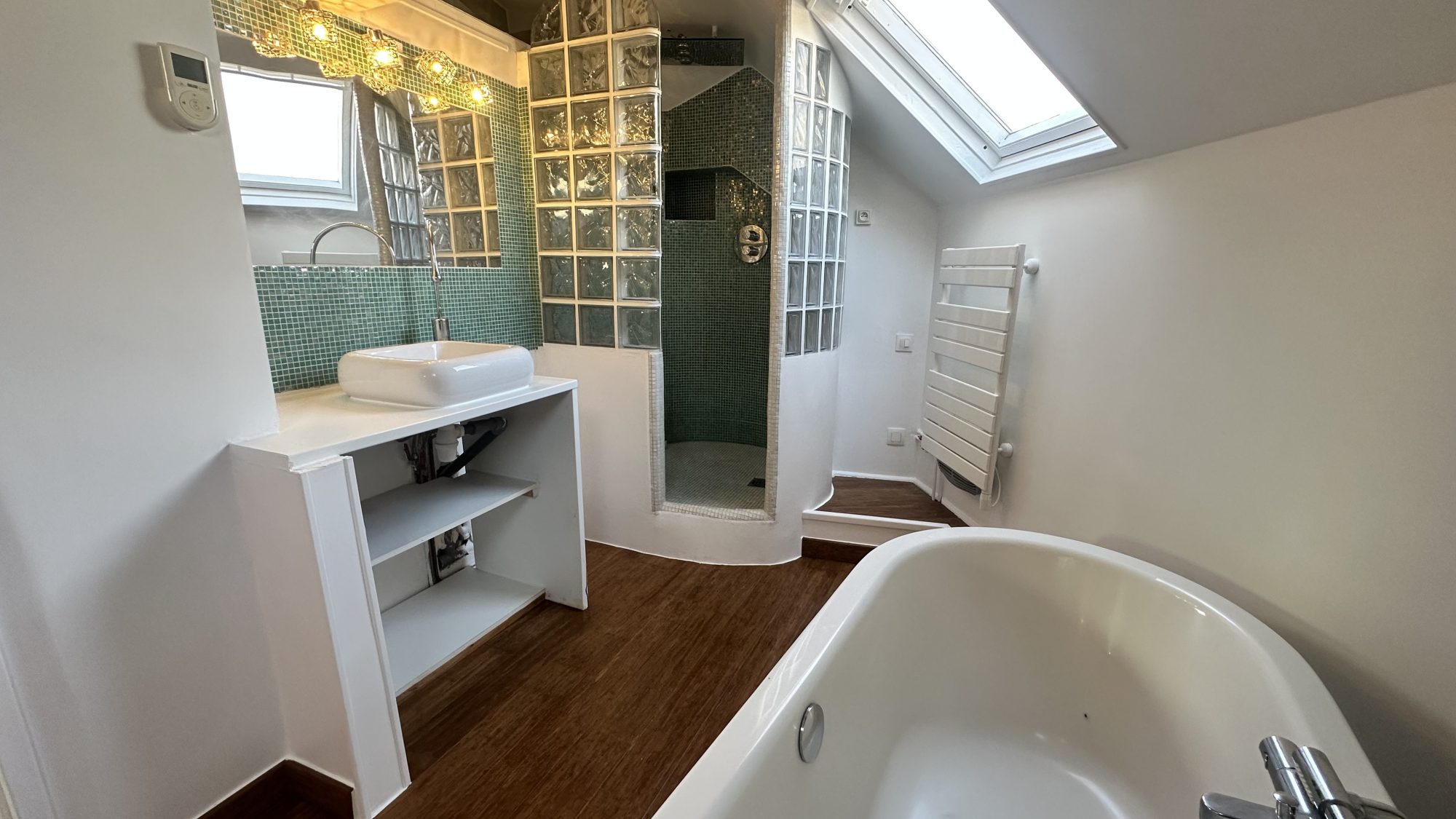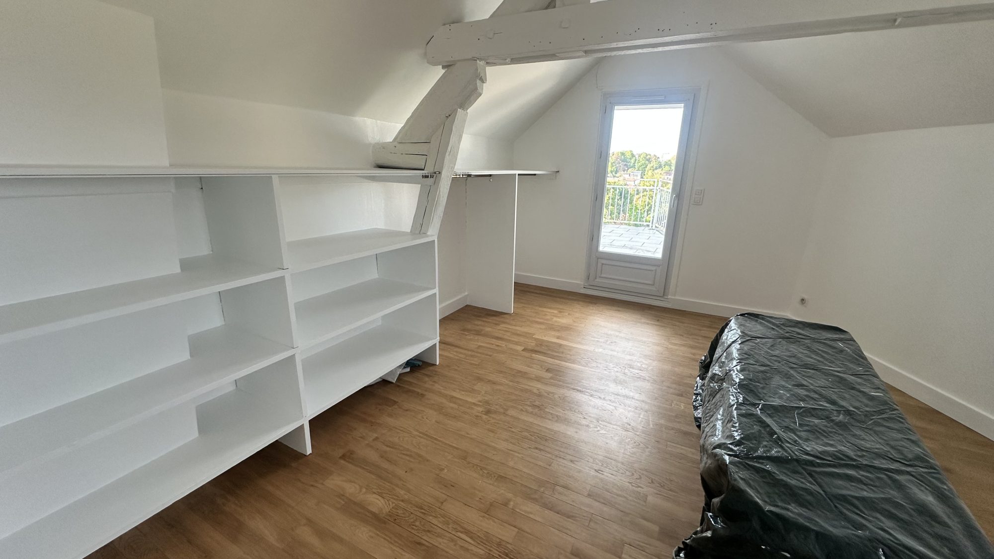 Il se compose : d'une pièce à vivre spacieuse avec belle hauteur sous plafond et poutres apparentes, d'une cuisine équipée organisée autour d'un magnifique îlot central, d'une grande chambre (16 m²) avec penderie et balcon offrant une vue imprenable sur Chantilly, et d'une grande salle de bain avec douche à l'italienne et baignoire en îlot.