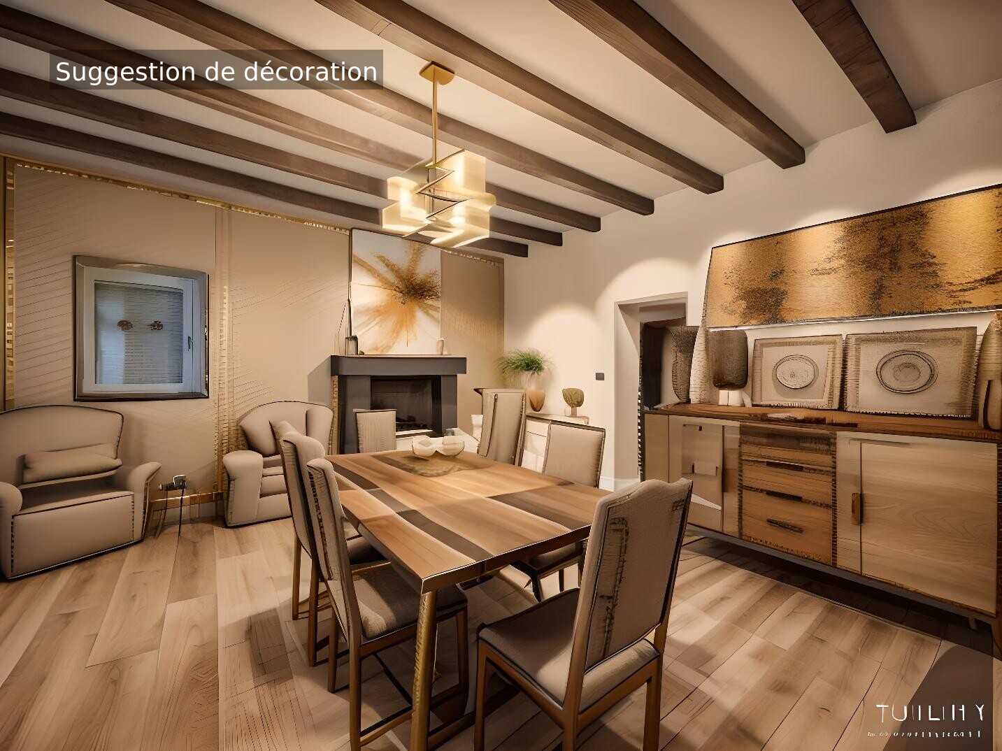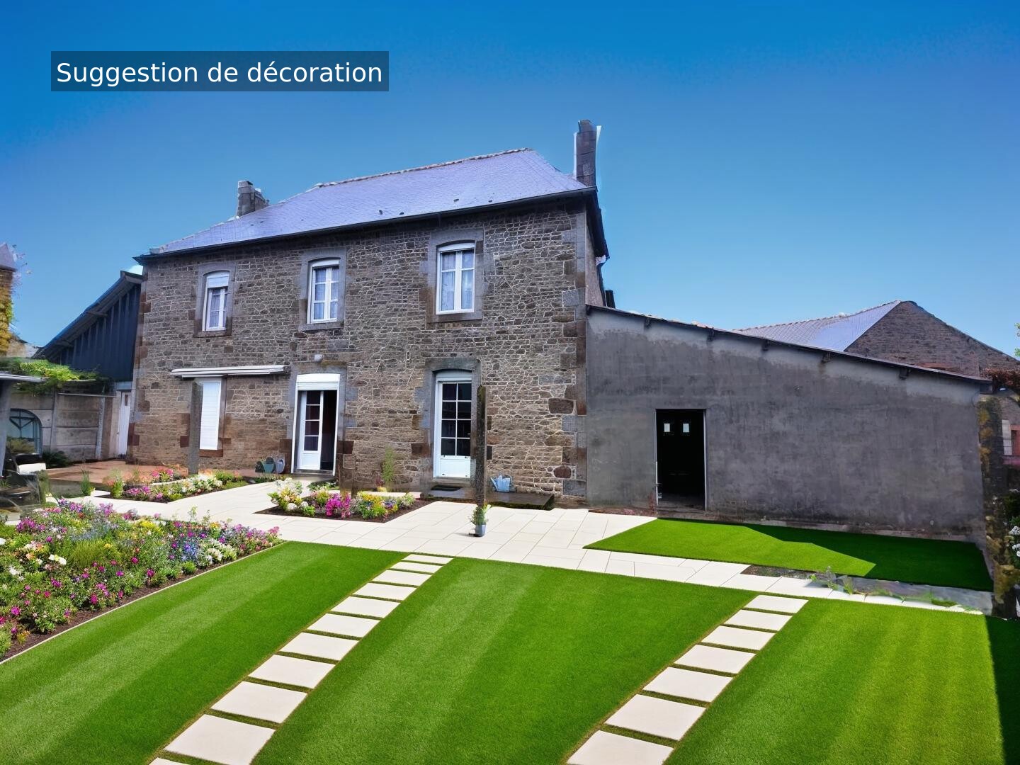 La maison propose au rez de chaussée un grand salon, un séjour de réception avec cheminée, une cuisine aménagée et équipée, une chambre, un wc et une salle d'eau.