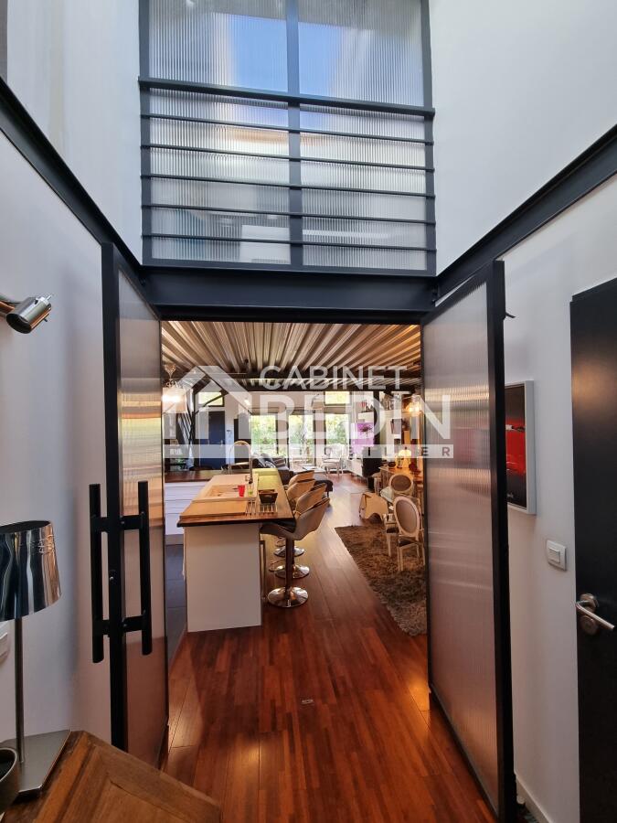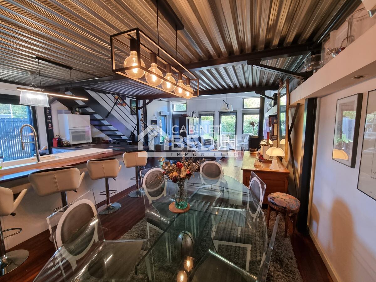 MERIGNAC LOFT PROCHE TRAM A. A deux pas du tram A (direction Bordeaux/Aéroport de Mérignac) au calme d'une petite copropriété sécurisée, ce loft a été réalisé dans le pur style industriel. Il comprend un vaste séjour cathédrale avec poêle à bois et climatisation, structuré par une alliance parfaite du verre et du métal. La pièce de vie est surplombée par une suite parentale en verrière qui dispose de sa salle d'eau et de son dressing. La cuisine américaine est équipée (plaque, four, hotte, cave à vin. . . ) et elle dispose d'un cellier/buanderie. Le rez-de-chaussée comprend également deux chambres qui s'ouvrent sur une terrasse. Une salle de bains aménagée avec baignoire et douche, ainsi qu?un bel espace bureau dans le style 'atelier d'artiste'. La petite copropriété comprend également une piscine chauffée de 8x4 et une salle de gym équipée avec douche et sauna. Enfin le bien dispose de deux places de parking, dont une 'boxable' qui est équipée d'une prise électrique. Vous serez séduit par cet original loft qui allie style et fonctionnalité, aux portes de Bordeaux!