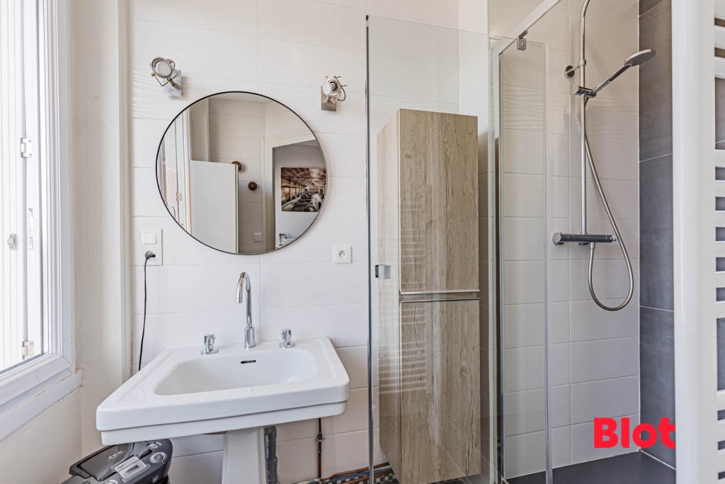 Côté agencement, un placard intégré se trouve dès l'entrée. Le couloir dessert une spacieuse chambre avec placard et accès direct à la salle d'eau, dotée d'une fenêtre.