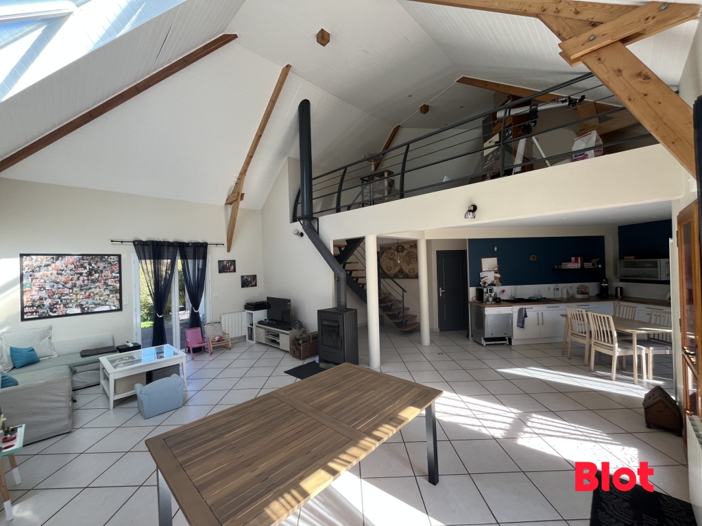 Vous serez accueillis par une pièce de vie de 35 m² ensoleillée grâce à son puits de lumière sur la plus belle hauteur, coin salon-séjour avec son poêle avec accès direct sur l'extérieur pour profiter à toute les saisons du jardin. Vous profiterez d'une cuisine familiale aménagée et équipée de 17 m².